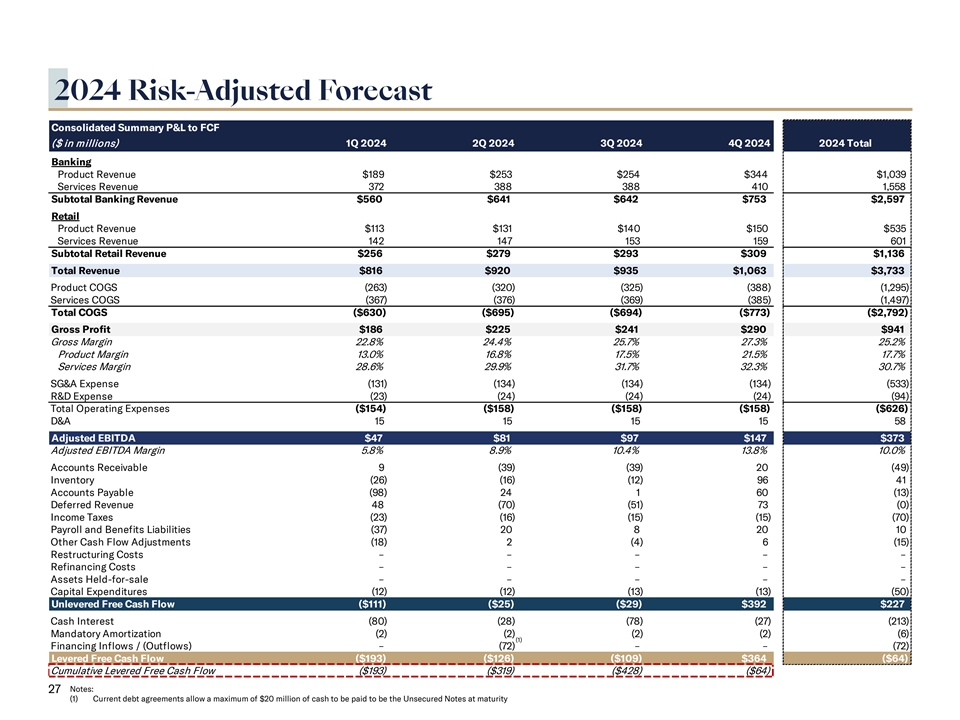 2024 Base Case Forecast Consolidated Summary P&L to FCF § Summary monthly output (condense where possible) ($ in millions) 1Q 2024 2Q 2024 3Q 2024 4Q 2024 2024 Total Banking Product Revenue $221 $276 $299 $367 $1,162 Services Revenue 380 396 397 413 1,587 Subtotal Banking Revenue $601 $672 $696 $780 $2,749 Retail Product Revenue $113 $133 $145 $151 $543 Services Revenue 142 147 153 158 599 Subtotal Retail Revenue $255 $280 $298 $310 $1,143 Total Revenue $856 $952 $994 $1,090 $3,892 Product COGS (286) (332) (364) (411) (1,393) Services COGS (372) (377) (372) (380) (1,501) Total COGS ($658) ($709) ($736) ($791) ($2,894) Gross Profit $197 $243 $258 $299 $998 Gross Margin 23.1% 25.5% 26.0% 27.4% 25.6% Product Margin 14.4% 18.9% 18.0% 20.7% 18.3% Services Margin 28.6% 30.5% 32.4% 33.6% 31.3% SG&A Expense (131) (134) (134) (134) (533) R&D Expense (23) (24) (24) (24) (94) Total Operating Expenses ($154) ($158) ($158) ($158) ($627) D&A 15 15 15 15 58 Adjusted EBITDA $58 $100 $115 $156 $428 Adjusted EBITDA Margin 6.8% 10.5% 11.6% 14.3% 11.0% Accounts Receivable 21 (30) (61) 46 (24) Inventory (58) (46) 3 87 (14) Accounts Payable (123) 12 24 42 (45) Deferred Revenue 48 (70) (51) 73 (0) Income Taxes (23) (16) (15) (15) (70) Payroll and Benefits Liabilities (37) 20 8 20 10 Other Cash Flow Adjustments (18) 2 (4) 6 (15) Restructuring Costs – – – – – Refinancing Costs – – – – – Assets Held-for-sale – – – – – Capital Expenditures (12) (12) (13) (13) (50) Unlevered Free Cash Flow ($145) ($40) $5 $400 $220 Cash Interest (80) (28) (79) (27) (213) Mandatory Amortization (2) (2) (2) (2) (6) (1) Financing Inflows / (Outflows) – (72) – – (72) Levered Free Cash Flow ($226) ($142) ($75) $372 ($71) Cumulative Levered Free Cash Flow ($226) ($368) ($443) ($71) Notes: 25 (1) Current debt agreements allow a maximum of $20 million of cash to be paid to be the Unsecured Notes at maturity