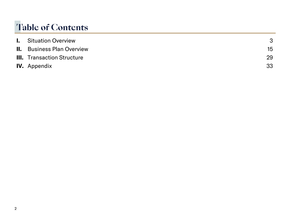 Table of Contents I. Situation Overview 3 II. Business Plan Overview 15 III. Transaction Structure 29 IV. Appendix 33 2
