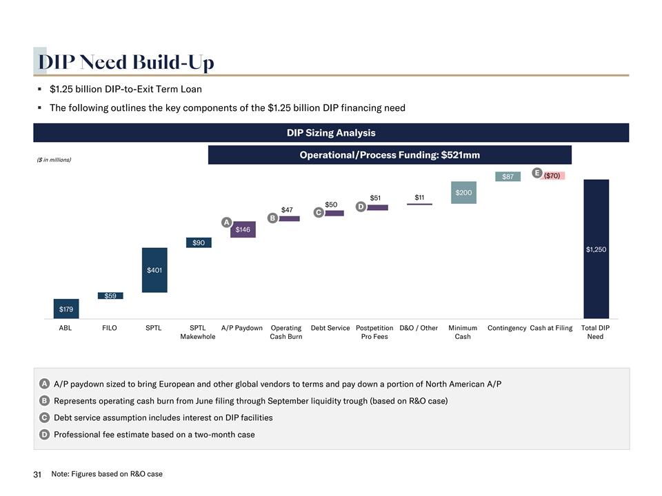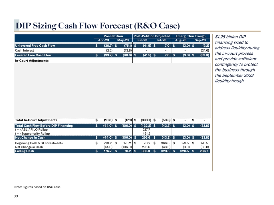 DIP Sizing Cash Flow Forecast (R&O Case) Pre-Petition Post-Petition Projected Emerg. T hru Trough $1.25 billion DIP Apr-23 May-23 Jun-23 Jul-23 Aug-23 Sep-23 financing sized to Unlevered F ree Cash F low $ (30.7) $ (75.1) $ (41.5) $ 7.0 $ (3.0) $ (9.2) address liquidity during Cash I nterest (2.5) (13.8) - - - (24.6) the in-court process Levered F ree Cash F low $ (33.2) $ (88.9) $ (41.5) $ 7.0 $ (3.0) $ ( 33.8) and provide sufficient In-Court A djustments () contingency to protect the business through the September 2023 liquidity trough y Total In-Court Adjustments $ (10.8) $ (17.1) $ (390.7) $ ( 50.3) $ - $ - Total C ash F low B efore D IP Financing $ (44.0) $ ( 106.0) $ (432.2) $ (43.3) $ (3.0) $ (33.8) ( + ) ABL / FILO Rollup 237.7 ( + ) S uperpriority R ollup 491.2 Net C hange i n Cash $ (44.0) $ (106.0) $ 296.6 $ ( 43.3) $ (3.0) $ ( 33.8) Beginning C ash & ST I nvestments $ 220 .2 $ 176.2 $ 7 0.2 $ 366.8 $ 323.5 $ 320.5 Net Change in Cash (44.0) (106.0) 29 6.6 (43.3) (3.0) (33.8) Ending C ash $ 176.2 $ 70.2 $ 3 66.8 $ 323.5 $ 3 20.5 $ 286.7 Note: Figures based on R&O case 30