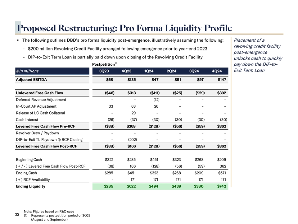 Proposed Restructuring: Pro Forma Liquidity Profile § The following outlines DBD’s pro forma liquidity post-emergence, illustratively assuming the following: Placement of a revolving credit facility – $200 million Revolving Credit Facility arranged following emergence prior to year-end 2023 post-emergence – DIP-to-Exit Term Loan is partially paid down upon closing of the Revolving Credit Facility unlocks cash to quickly (1) Postpetition pay down the DIP-to- Exit Term Loan $ in millions 3Q23 4Q23 1Q24 2Q24 3Q24 4Q24 Adjusted EBITDA $68 $135 $47 $81 $97 $147 Unlevered Free Cash Flow ($46) $313 ($111) ($25) ($29) $392 Deferred Revenue Adjustment – – (12) – – – In-Court AP Adjustment 33 63 26 – – – Release of LC Cash Collateral – 29 – – – – Cash Interest (26) (37) (30) (30) (30) (30) Levered Free Cash Flow Pre-RCF ($38) $368 ($128) ($56) ($59) $362 Revolver Draw / Paydown – – – – – – DIP-to-Exit TL Paydown @ RCF Closing – (202) – – – – Levered Free Cash Flow Post-RCF ($38) $166 ($128) ($56) ($59) $362 Beginning Cash $322 $285 $451 $323 $268 $209 ( + / - ) Levered Free Cash Flow Post-RCF (38) 166 (128) (56) (59) 362 Ending Cash $285 $451 $323 $268 $209 $571 ( + ) RCF Availability - 171 171 171 171 171 Ending Liquidity $285 $622 $494 $439 $380 $742 Note: Figures based on R&O case 32 (1) Represents postpetition period of 3Q23 (August and September)