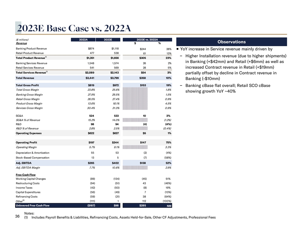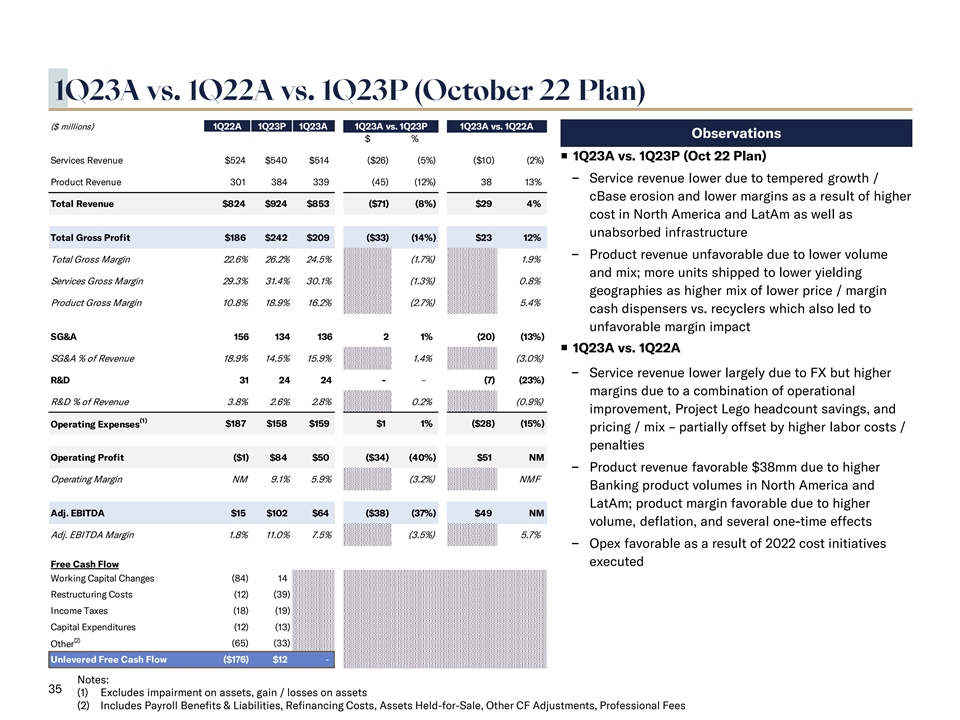 2023 Base Case vs. October 2022 Plan § 2023 Product revenue ~$6mm lower vs. October 2022 Plan − 62k ATM revenue units vs. 60k in October 2022 Plan (+2k units) (1) − 39k SCO revenue units vs. 38k in October 2022 Plan (+1k units) − 125k EPOS revenue units vs. 134k in October 2022 Plan (-9k units) § 2023 Services revenue ~$50mm lower vs. October 2022 Plan − Significant drivers include: Revenue • Banking cBase erosion in Europe of 5% vs. expected to remain flat in October 2022 Plan • Banking cBase in North America and LatAm growing low single digits in line with October 2022 Plan; APAC and MEA cBase low single digit erosion in line with October 2022 Plan • Retail Product Related Services (PRS) $10M unfavorable to October 2022 Plan due to flattish legacy Retail service (EPOS) § Key drivers of the ~$68mm lower 2023 Adj. EBITDA forecast include: − Lower Product margins of ~180bps ($29mm) mainly on banking side - significant portion attributable to unfavorable mix, including higher modeled shipments to LatAm Adjusted EBITDA − Lower Service margins of 50bps ($11mm) – mainly driven by underperformance in 1Q23 (130bps) as a result of higher costs and penalties incurred, 2H23 weighted savings, as well as unabsorbed infrastructure. Q2 - Q423 margin growth to partially offset 1Q23 miss Note: 34 (1) As compared to historical public filings, SCO Revenue Units has been revised to include the sale of kiosks, which are similar in price / function to SCO devices. This change is consistent with how management is analyzing the business. Excluding kiosks included in the October 2022 plan, 2023 SCO revenue units would be 35k.