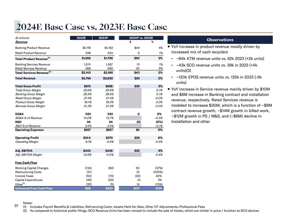2023E Base Case vs. 2022A ($ millions) 2022A 2023E 2023E vs. 2022A Observations Revenue $ % Banking Product Revenue $874 $1,118 $244 28% ¡ YoY increase in Service revenue mainly driven by Retail Product Revenue 477 538 61 13% − Higher Installation revenue (due to higher shipments) (1) Total Product Revenue $1,351 $1,656 $305 23% in Banking (+$42mm) and Retail (+$6mm) as well as Banking Services Revenue 1,548 1,574 26 2% Retail Services Revenue 541 569 28 5% increased Contract revenue in Retail (+$19mm) (1) Total Services Revenue $2,089 $2,143 $54 3% partially offset by decline in Contract revenue in Total Revenue $3,441 $3,799 $358 10% Banking (-$10mm) Total Gross Profit $819 $972 $153 19% − Banking cBase flat overall; Retail SCO cBase Total Gross Margin 23.8% 25.6% 1.8% showing growth YoY ~40% Banking Gross Margin 27.9% 29.5% 1.5% Retail Gross Margin 26.5% 27.4% 0.9% Product Gross Margin 13.6% 18.1% 4.5% Services Gross Margin 30.4% 31.3% 0.9% SG&A 524 533 10 2% SG&A % of Revenue 15.2% 14.0% (1.2%) R&D 98 94 (4) (4%) R&D % of Revenue 2.8% 2.5% (0.4%) Operating Expenses $622 $627 $5 1% Operating Profit $197 $344 $147 75% Operating Margin 5.7% 9.1% 3.3% Depreciation & Amortization 55 53 (2) (4%) Stock-Based Compensation 13 5 (7) (58%) Adj. EBITDA $265 $402 $138 52% Adj. EBITDA Margin 7.7% 10.6% 2.9% Free Cash Flow Working Capital Changes (89) (134) (45) 51% Restructuring Costs (94) ( 51) 43 (46%) Income Taxes (42) (50) (8) 19% Capital Expenditures (56) (49) 7 (13%) Refinancing Costs (59) (21) 38 (64%) (2) Other (111) 1 112 (100%) Unlevered Free Cash Flow ($187) $98 $285 NM Notes: 36 (1) Includes Payroll Benefits & Liabilities, Refinancing Costs, Assets Held-for-Sale, Other CF Adjustments, Professional Fees