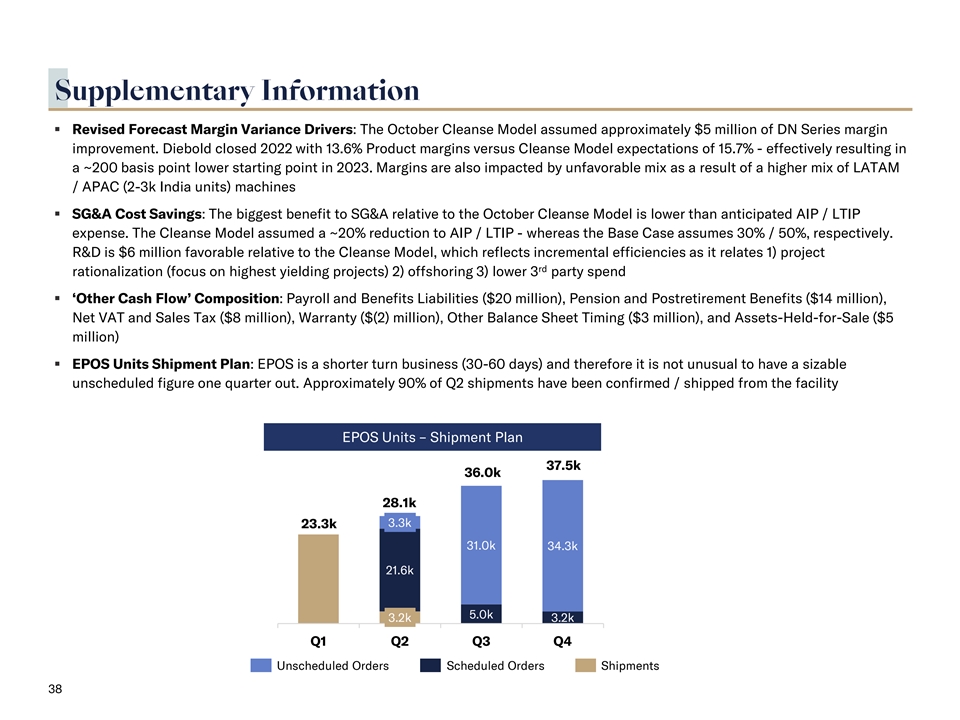 Supplementary Information § Revised Forecast Margin Variance Drivers: The October Cleanse Model assumed approximately $5 million of DN Series margin improvement. Diebold closed 2022 with 13.6% Product margins versus Cleanse Model expectations of 15.7% - effectively resulting in a ~200 basis point lower starting point in 2023. Margins are also impacted by unfavorable mix as a result of a higher mix of LATAM / APAC (2-3k India units) machines § SG&A Cost Savings: The biggest benefit to SG&A relative to the October Cleanse Model is lower than anticipated AIP / LTIP expense. The Cleanse Model assumed a ~20% reduction to AIP / LTIP - whereas the Base Case assumes 30% / 50%, respectively. R&D is $6 million favorable relative to the Cleanse Model, which reflects incremental efficiencies as it relates 1) project rd rationalization (focus on highest yielding projects) 2) offshoring 3) lower 3 party spend § ‘Other Cash Flow’ Composition: Payroll and Benefits Liabilities ($20 million), Pension and Postretirement Benefits ($14 million), Net VAT and Sales Tax ($8 million), Warranty ($(2) million), Other Balance Sheet Timing ($3 million), and Assets-Held-for-Sale ($5 million) § EPOS Units Shipment Plan: EPOS is a shorter turn business (30-60 days) and therefore it is not unusual to have a sizable unscheduled figure one quarter out. Approximately 90% of Q2 shipments have been confirmed / shipped from the facility EPOS Units – Shipment Plan 37.5k 36.0k 28.1k 3.3k 23.3k 31.0k 34.3k 21.6k 5.0k 3.2k 3.2k Q1 Q2 Q3 Q4 Unscheduled Orders Scheduled Orders Shipments 38