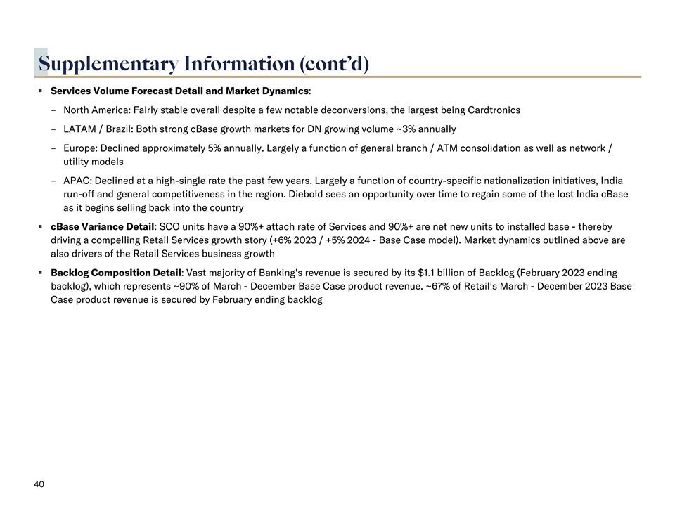 Supplementary Information (cont’d) § Services Volume Forecast Detail and Market Dynamics: – North America: Fairly stable overall despite a few notable deconversions, the largest being Cardtronics – LATAM / Brazil: Both strong cBase growth markets for DN growing volume ~3% annually – Europe: Declined approximately 5% annually. Largely a function of general branch / ATM consolidation as well as network / utility models – APAC: Declined at a high-single rate the past few years. Largely a function of country-specific nationalization initiatives, India run-off and general competitiveness in the region. Diebold sees an opportunity over time to regain some of the lost India cBase as it begins selling back into the country § cBase Variance Detail: SCO units have a 90%+ attach rate of Services and 90%+ are net new units to installed base - thereby driving a compelling Retail Services growth story (+6% 2023 / +5% 2024 - Base Case model). Market dynamics outlined above are also drivers of the Retail Services business growth § Backlog Composition Detail: Vast majority of Banking's revenue is secured by its $1.1 billion of Backlog (February 2023 ending backlog), which represents ~90% of March - December Base Case product revenue. ~67% of Retail's March - December 2023 Base Case product revenue is secured by February ending backlog 40