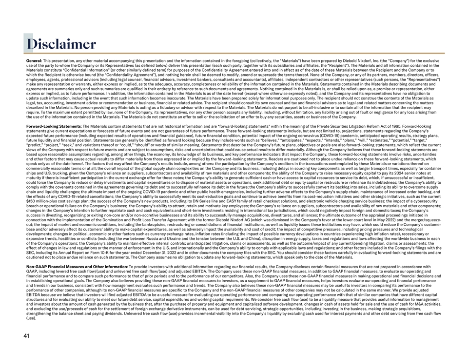 Disclaimer General: This presentation, any other material accompanying this presentation and the information contained in the foregoing (collectively, the “Materials”) have been prepared by Diebold Nixdorf, Inc. (the “Company”) for the exclusive use of the party to whom the Company or its Representatives (as defined below) deliver this presentation (each such party, together with its subsidiaries and affiliates, the “Recipient”). The Materials and all information contained in the Materials constitute “Confidential Information” (or other similarly defined term) for purposes of the Confidentiality Agreement entered into and in effect as of the date of these Materials between the Recipient and the Company or to which the Recipient is otherwise bound (the “Confidentiality Agreement”), and nothing herein shall be deemed to modify, amend or supersede the terms thereof. None of the Company, or any of its partners, members, directors, officers, employees, agents, professional advisors (including legal counsel, financial advisors, investment bankers, consultants and accountants), affiliates, independent contractors or other representatives (such persons, the “Representatives”) make any representation or warranty, either express or implied, as to the adequacy, accuracy, completeness or reliability of the information contained in the Materials. Statements contained in the Materials describing documents and agreements are summaries only and such summaries are qualified in their entirety by reference to such documents and agreements. Nothing contained in the Materials is, or shall be relied upon as, a promise or representation, either express or implied, as to future performance. In addition, the information contained in the Materials is as of the date hereof (except where otherwise expressly noted), and the Company and its representatives have no obligation to update such information, including in the event that such information becomes inaccurate. The Materials have been prepared solely for informational purposes only. The recipient should not construe the contents of the Materials as legal, tax, accounting, investment advice or recommendation or business, financial or related advice. The recipient should consult its own counsel and tax and financial advisors as to legal and related matters concerning the matters described in the Materials. No person providing any Materials is acting as a fiduciary or advisor with respect to the Materials. The Materials do not purport to be all-inclusive or to contain all of the information that the recipient may require. To the maximum extent permitted by law, none of the Company, its representatives, nor any other person accepts any liability, including, without limitation, any liability arising out of fault or negligence for any loss arising from the use of the information contained in the Materials. The Materials do not constitute an offer to sell or the solicitation of an offer to buy any securities, assets or business of the Company. Forward-Looking Statements: The Materials contain statements that are not historical information and are “forward-looking statements” within the meaning of the Private Securities Litigation Reform Act of 1995. Forward-looking statements give current expectations or forecasts of future events and are not guarantees of future performance. These forward-looking statements include, but are not limited to, projections, statements regarding the Company’s expected future performance (including expected results of operations and financial guidance), future financial condition, potential impact of the ongoing coronavirus (COVID-19) pandemic, anticipated operating results, strategy plans, future liquidity and financial position. Statements can generally be identified as forward looking because they include words such as “believes,” “anticipates,” “expects,” “intends,” “plans,” “will,” “estimates,” “potential,” “target,” “predict,” “project,” “seek,” and variations thereof or “could,” “should” or words of similar meaning. Statements that describe the Company’s future plans, objectives or goals are also forward-looking statements, which reflect the current views of the Company with respect to future events and are subject to assumptions, risks and uncertainties that could cause actual results to differ materially. Although the Company believes that these forward-looking statements are based upon reasonable assumptions regarding, among other things, the economy, its knowledge of its business, and key performance indicators that impact the Company, these forward-looking statements involve risks, uncertainties and other factors that may cause actual results to differ materially from those expressed in or implied by the forward-looking statements. Readers are cautioned not to place undue reliance on these forward-looking statements, which speak only as of the date hereof. The factors that may affect the Company’s results include, among others: the participation by the Company’s creditors in the transactions contemplated by these Materials or variations thereof on commercially reasonable terms or at all; the overall impact of the global supply chain complexities on the Company and its business, including delays in sourcing key components as well as longer transport times, especially for container ships and U.S. trucking, given the Company’s reliance on suppliers, subcontractors and availability of raw materials and other components; the ability of the Company to raise necessary equity capital to pay its 2024 senior notes at maturity if there is insufficient participation in the current exchange offer for those notes; the Company’s ability to generate sufficient cash or have access to capital resources to service its debt, which, if unsuccessful or insufficient, could force the Company to reduce or delay investments and capital expenditures or to dispos