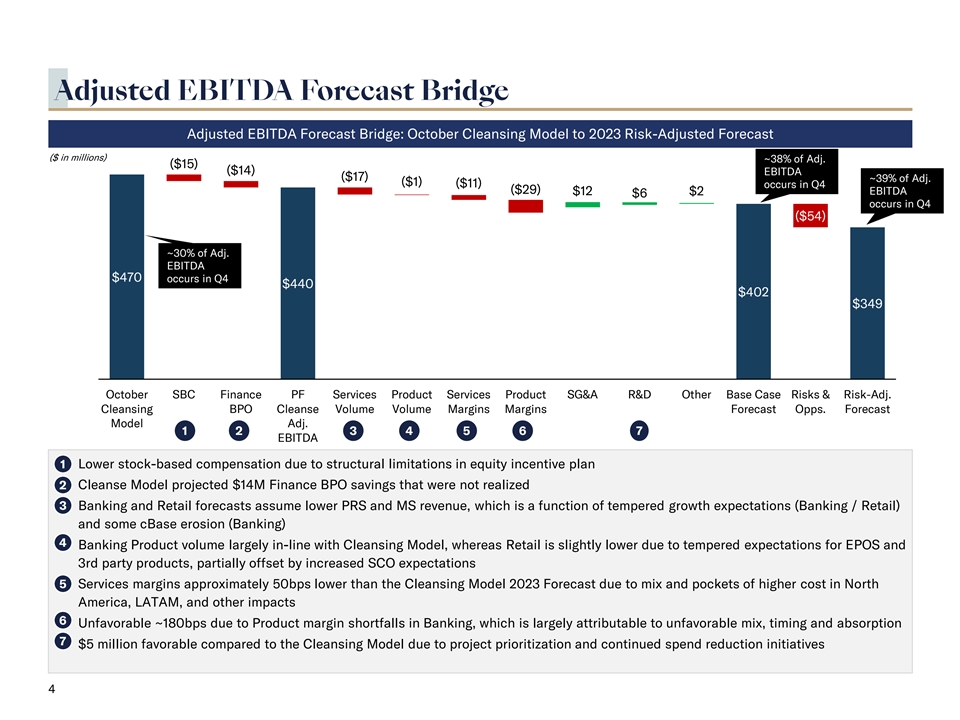 Adjusted EBITDA Forecast Bridge Adjusted EBITDA Forecast Bridge: October Cleansing Model to 2023 Risk-Adjusted Forecast ($ in millions) ~38% of Adj. ($15) ($14) EBITDA ($17) ~39% of Adj. ($1) ($11) occurs in Q4 ($29) EBITDA $12 $2 $6 occurs in Q4 ($54) ~30% of Adj. EBITDA $470 occurs in Q4 $440 $402 $349 October SBC Finance PF Services Product Services Product SG&A R&D Other Base Case Risks & Risk-Adj. Cleansing BPO Cleanse Volume Volume Margins Margins Forecast Opps. Forecast Model Adj. 1 2 3 4 5 6 7 EBITDA § 1 Lower stock-based compensation due to structural limitations in equity incentive plan 2§ Cleanse Model projected $14M Finance BPO savings that were not realized 3§ Banking and Retail forecasts assume lower PRS and MS revenue, which is a function of tempered growth expectations (Banking / Retail) and some cBase erosion (Banking) 4 § Banking Product volume largely in-line with Cleansing Model, whereas Retail is slightly lower due to tempered expectations for EPOS and 3rd party products, partially offset by increased SCO expectations 5§ Services margins approximately 50bps lower than the Cleansing Model 2023 Forecast due to mix and pockets of higher cost in North America, LATAM, and other impacts 6 § Unfavorable ~180bps due to Product margin shortfalls in Banking, which is largely attributable to unfavorable mix, timing and absorption 7 § $5 million favorable compared to the Cleansing Model due to project prioritization and continued spend reduction initiatives 4