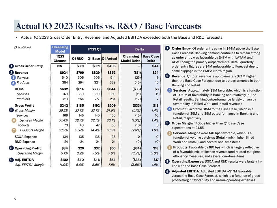 Actual 1Q 2023 Results vs. R&O / Base Forecasts § Actual 1Q 2023 Gross Order Entry, Revenue, and Adjusted EBITDA exceeded both the Base and R&O forecasts Cleansing ($ in millions) 1 § Order Entry: Q1 order entry came in $44M above the Base FY23 Q1 Delta Model Case Forecast. Banking demand continues to remain strong 1Q23 Cleansing Base Case as order entry was favorable by $47M with LATAM and Q1 R&O Q1 Base Q1 Actual Cleanse Model Delta Delta APAC being the primary outperformers. Retail quarterly Gross Order Entry NA $361 $361 $405 – $44 1 order entry figures are $4M unfavorable to Forecast due to some slippage in the EMEA North region 2 Revenue $924 $799 $829 $853 ($71) $24 2 § Revenue: Q1 total revenue is approximately $24M higher Services 540 505 506 514 (26) 9 3 than the Base Case Forecast due to outperformance in both Products 384 294 324 339 (45) 15 4 Banking and Retail COGS $682 $614 $638 $644 ($38) $6 3 – Services: Approximately $9M favorable, which is a function Services 371 360 360 360 (11) (1) of ~$10M of favorability in Banking and relatively in-line Products 311 254 277 284 (27) 7 Retail results. Banking outperformance largely driven by favorability in Billed Work and Install revenues Gross Profit $242 $185 $192 $209 ($33) $18 – 4 Product: Favorable $15M to the Base Case, which is a 5 Gross Margin 26.2% 23.1% 23.1% 24.5% (1.7%) 1.4% function of $5M and $9M outperformance in Banking and Services 169 145 145 155 (15) 10 Retail, respectively Services Margin 31.4% 28.7% 28.7% 30.1% (1.3%) 1.4% 6 5§ Gross Margin: 140bps higher than Q1 Base Case Products 73 40 47 55 (18) 8 expectations at 24.5% Products Margin 18.9% 13.6% 14.4% 16.2% (2.8%) 1.8% 7 – Services: Margins were 140 bps favorable, which is a 6 SG&A Expense 134 135 135 136 2 0 function of volume catch-up (Retail), mix (higher Billed R&D Expense 24 24 24 24 (0) (0) Work and Install), and several one-time items – Products: Favorable by 180 bps which is largely reflective 7 8 Operating Profit $84 $26 $32 $50 ($34) $18 of a favorable mix of license revenue (and related margins), Operating Margin 9.1% 3.2% 3.9% 5.9% (3.2%) 2.0% efficiency measures, and several one-time items 9 Adj. EBITDA $102 $40 $46 $64 ($38) $17 8§ Operating Expenses: SG&A and R&D results were largely in- Adj. EBITDA Margin 11.0% 5.0% 5.6% 7.5% (3.6%) 1.9% line with the Base Case Forecast 9§ Adjusted EBITDA: Adjusted EBITDA ~$17M favorable versus the Base Case Forecast, which is a function of gross profit/margin favorability and in-line operating expenses 5