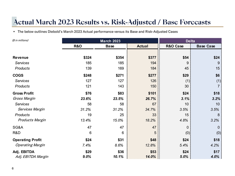Actual March 2023 Results vs. Risk-Adjusted / Base Forecasts § The below outlines Diebold’s March 2023 Actual performance versus its Base and Risk-Adjusted Cases ($ in millions) March 2023 Delta R&O Base Actual R&O Case Base Case Revenue $324 $354 $377 $54 $24 Services 185 185 194 9 9 Products 139 169 184 45 15 COGS $248 $271 $277 $29 $6 Services 127 127 126 (1) (1) Products 121 143 150 30 7 Gross Profit $76 $83 $101 $24 $18 Gross Margin 23.6% 23.5% 26.7% 3.1% 3.2% Services 58 58 67 10 10 Services Margin 31.2% 31.2% 34.7% 3.5% 3.5% Products 19 25 33 15 8 Products Margin 13.4% 15.0% 18.2% 4.8% 3.2% SG&A 47 47 47 0 0 R&D 6 6 5 (0) (0) Operating Profit $24 $31 $48 $24 $18 Operating Margin 7.4% 8.6% 12.8% 5.4% 4.2% Adj. EBITDA $29 $36 $53 $24 $17 Adj. EBITDA Margin 9.0% 10.1% 14.0% 5.0% 4.0% 6