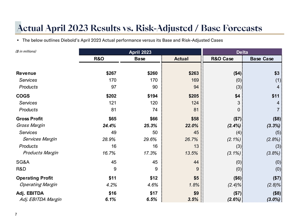 Actual April 2023 Results vs. Risk-Adjusted / Base Forecasts § The below outlines Diebold’s April 2023 Actual performance versus its Base and Risk-Adjusted Cases ($ in millions) April 2023 Delta R&O Base Actual R&O Case Base Case Revenue $267 $260 $263 ($4) $3 Services 170 170 169 (0) (1) Products 97 90 94 (3) 4 COGS $202 $194 $205 $4 $11 Services 121 120 124 3 4 Products 81 74 81 0 7 Gross Profit $65 $66 $58 ($7) ($8) Gross Margin 24.4% 25.3% 22.0% (2.4%) (3.3%) Services 49 50 45 (4) (5) Services Margin 28.9% 29.6% 26.7% (2.1%) (2.8%) Products 16 16 13 (3) (3) Products Margin 16.7% 17.3% 13.5% (3.1%) (3.8%) SG&A 45 45 44 (0) (0) R&D 9 9 9 (0) (0) Operating Profit $11 $12 $5 ($6) ($7) Operating Margin 4.2% 4.6% 1.8% (2.4)% (2.8)% Adj. EBITDA $16 $17 $9 ($7) ($8) Adj. EBITDA Margin 6.1% 6.5% 3.5% (2.6%) (3.0%) 7