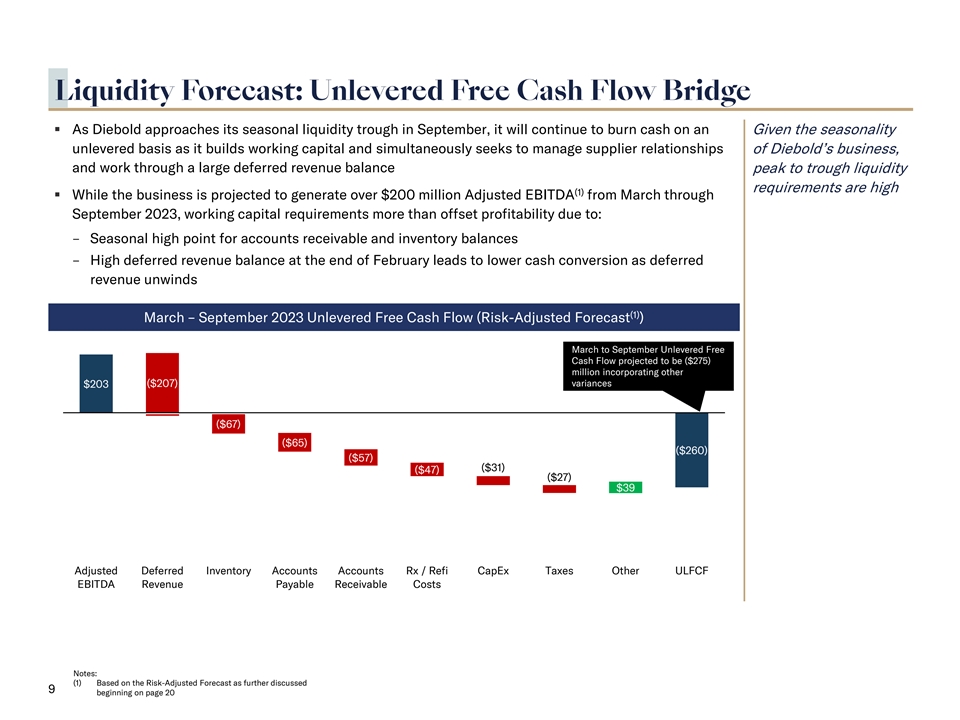 Actual 1Q23 Liquidity vs. December Transaction Forecast § Through 1Q23, Diebold’s liquidity is approximately $71 million lower than projected by the December Through 1Q23, DBD’s Transaction forecast ($126 million lower excluding proceeds from the March 2023 FILO transaction) liquidity position has declined relative to the § Variance to the December Transaction is driven by various factors, including: forecast provided to – EBITDA performance below plan, which is partially due to underperformance in 4Q22, coupled with lenders during the measures to spread seasonality assumed in the December Transaction not materializing in 1Q23 December Transaction process – Less net cash proceeds from December Transaction than originally anticipated – ABL borrowing base not meeting forecast on availability § FILO was designed to be an interim solution to get Diebold through 1Q23 to develop a permanent solution Actual 1Q23 Liquidity Relative to December Transaction Forecast ($ in millions) ($28) ($34) ($38) $263 (2) ($9) ($52) FILO $35 $55 Bridge Loan $334 Account Receivable: $12 Inventory: ($52) $208 Accounts Payable: $24 Deferred Revenue: $51 December Q4 22 Q1 23 Working Transaction Borrowing Other Actual 1Q23 Transaction EBITDA EBITDA Capital Costs Base 1Q23 Reduction Forecast Notes: (1) Based on the Risk-Adjusted Forecast as further discussed beginning on page 20 8 (2) Variance due to rounding