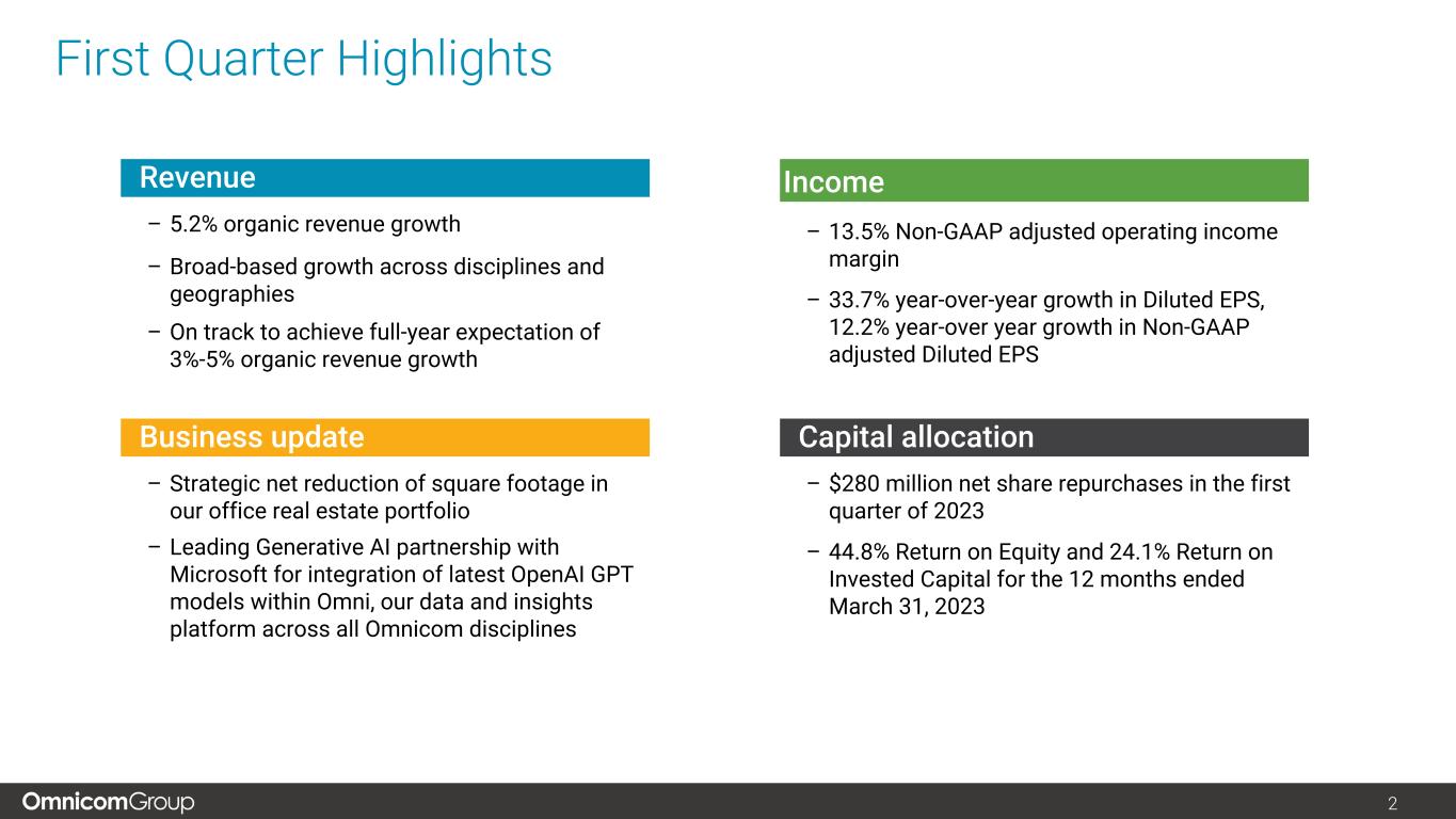 2 First Quarter Highlights Revenue – 5.2% organic revenue growth – Broad-based growth across disciplines and geographies – On track to achieve full-year expectation of 3%-5% organic revenue growth Income – 13.5% Non-GAAP adjusted operating income margin – 33.7% year-over-year growth in Diluted EPS, 12.2% year-over year growth in Non-GAAP adjusted Diluted EPS Business update – Strategic net reduction of square footage in our office real estate portfolio – Leading Generative AI partnership with Microsoft for integration of latest OpenAI GPT models within Omni, our data and insights platform across all Omnicom disciplines Capital allocation – $280 million net share repurchases in the first quarter of 2023 – 44.8% Return on Equity and 24.1% Return on Invested Capital for the 12 months ended March 31, 2023