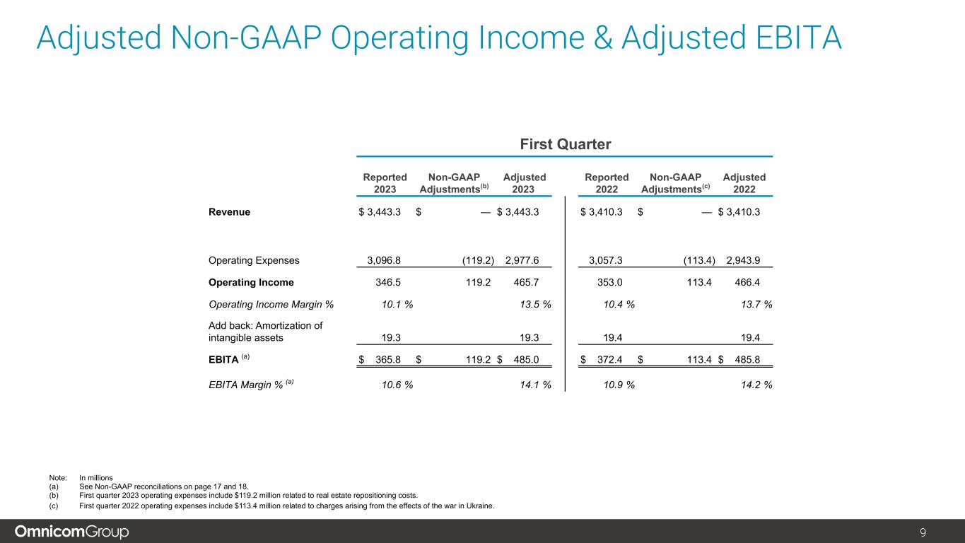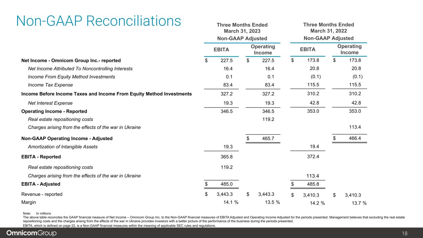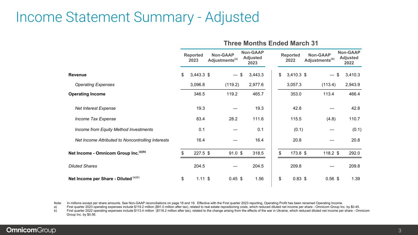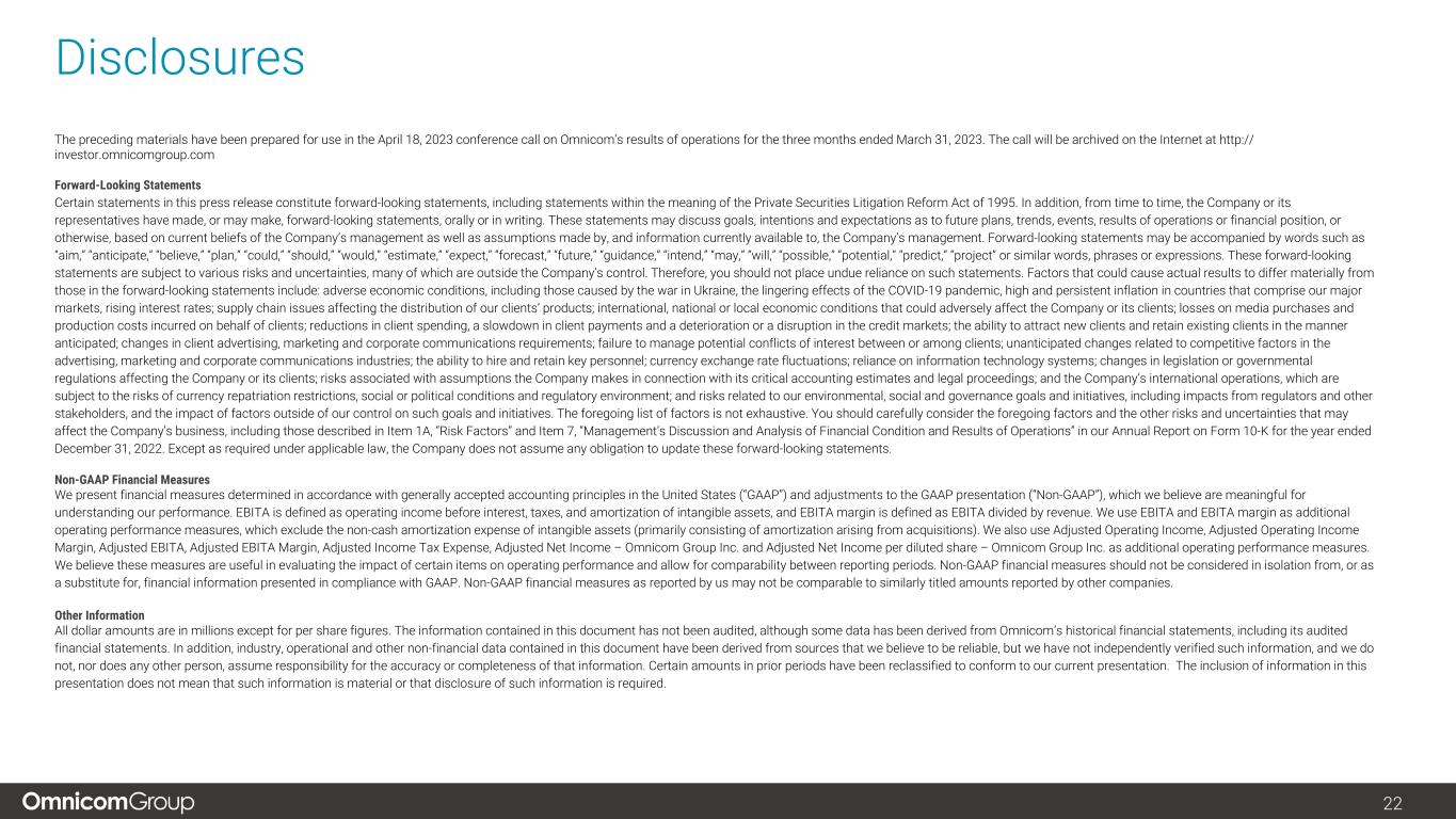 22 Disclosures The preceding materials have been prepared for use in the April 18, 2023 conference call on Omnicom’s results of operations for the three months ended March 31, 2023. The call will be archived on the Internet at http:// investor.omnicomgroup.com Forward-Looking Statements Certain statements in this press release constitute forward-looking statements, including statements within the meaning of the Private Securities Litigation Reform Act of 1995. In addition, from time to time, the Company or its representatives have made, or may make, forward-looking statements, orally or in writing. These statements may discuss goals, intentions and expectations as to future plans, trends, events, results of operations or financial position, or otherwise, based on current beliefs of the Company’s management as well as assumptions made by, and information currently available to, the Company’s management. Forward-looking statements may be accompanied by words such as “aim,” “anticipate,” “believe,” “plan,” “could,” “should,” “would,” “estimate,” “expect,” “forecast,” “future,” “guidance,” “intend,” “may,” “will,” “possible,” “potential,” “predict,” “project” or similar words, phrases or expressions. These forward-looking statements are subject to various risks and uncertainties, many of which are outside the Company’s control. Therefore, you should not place undue reliance on such statements. Factors that could cause actual results to differ materially from those in the forward-looking statements include: adverse economic conditions, including those caused by the war in Ukraine, the lingering effects of the COVID-19 pandemic, high and persistent inflation in countries that comprise our major markets, rising interest rates; supply chain issues affecting the distribution of our clients’ products; international, national or local economic conditions that could adversely affect the Company or its clients; losses on media purchases and production costs incurred on behalf of clients; reductions in client spending, a slowdown in client payments and a deterioration or a disruption in the credit markets; the ability to attract new clients and retain existing clients in the manner anticipated; changes in client advertising, marketing and corporate communications requirements; failure to manage potential conflicts of interest between or among clients; unanticipated changes related to competitive factors in the advertising, marketing and corporate communications industries; the ability to hire and retain key personnel; currency exchange rate fluctuations; reliance on information technology systems; changes in legislation or governmental regulations affecting the Company or its clients; risks associated with assumptions the Company makes in connection with its critical accounting estimates and legal proceedings; and the Company’s international operations, which are subject to the risks of currency repatriation restrictions, social or political conditions and regulatory environment; and risks related to our environmental, social and governance goals and initiatives, including impacts from regulators and other stakeholders, and the impact of factors outside of our control on such goals and initiatives. The foregoing list of factors is not exhaustive. You should carefully consider the foregoing factors and the other risks and uncertainties that may affect the Company’s business, including those described in Item 1A, “Risk Factors” and Item 7, “Management’s Discussion and Analysis of Financial Condition and Results of Operations” in our Annual Report on Form 10-K for the year ended December 31, 2022. Except as required under applicable law, the Company does not assume any obligation to update these forward-looking statements. Non-GAAP Financial Measures We present financial measures determined in accordance with generally accepted accounting principles in the United States (“GAAP”) and adjustments to the GAAP presentation (“Non-GAAP”), which we believe are meaningful for understanding our performance. EBITA is defined as operating income before interest, taxes, and amortization of intangible assets, and EBITA margin is defined as EBITA divided by revenue. We use EBITA and EBITA margin as additional operating performance measures, which exclude the non-cash amortization expense of intangible assets (primarily consisting of amortization arising from acquisitions). We also use Adjusted Operating Income, Adjusted Operating Income Margin, Adjusted EBITA, Adjusted EBITA Margin, Adjusted Income Tax Expense, Adjusted Net Income – Omnicom Group Inc. and Adjusted Net Income per diluted share – Omnicom Group Inc. as additional operating performance measures. We believe these measures are useful in evaluating the impact of certain items on operating performance and allow for comparability between reporting periods. Non-GAAP financial measures should not be considered in isolation from, or as a substitute for, financial information presented in compliance with GAAP. Non-GAAP financial measures as reported by us may not be comparable to similarly titled amounts reported by other companies. Other Information All dollar amounts are in millions except for per share figures. The information contained in this document has not been audited, although some data has been derived from Omnicom’s historical financial statements, including its audited financial statements. In addition, industry, operational and other non-financial data contained in this document have been derived from sources that we believe to be reliable, but we have not independently verified such information, and we do not, nor does any other person, assume responsibility for the accuracy or completeness of that information. Certain amounts in prior periods have been reclassified to conform to our current presentation. The inclusion of information 