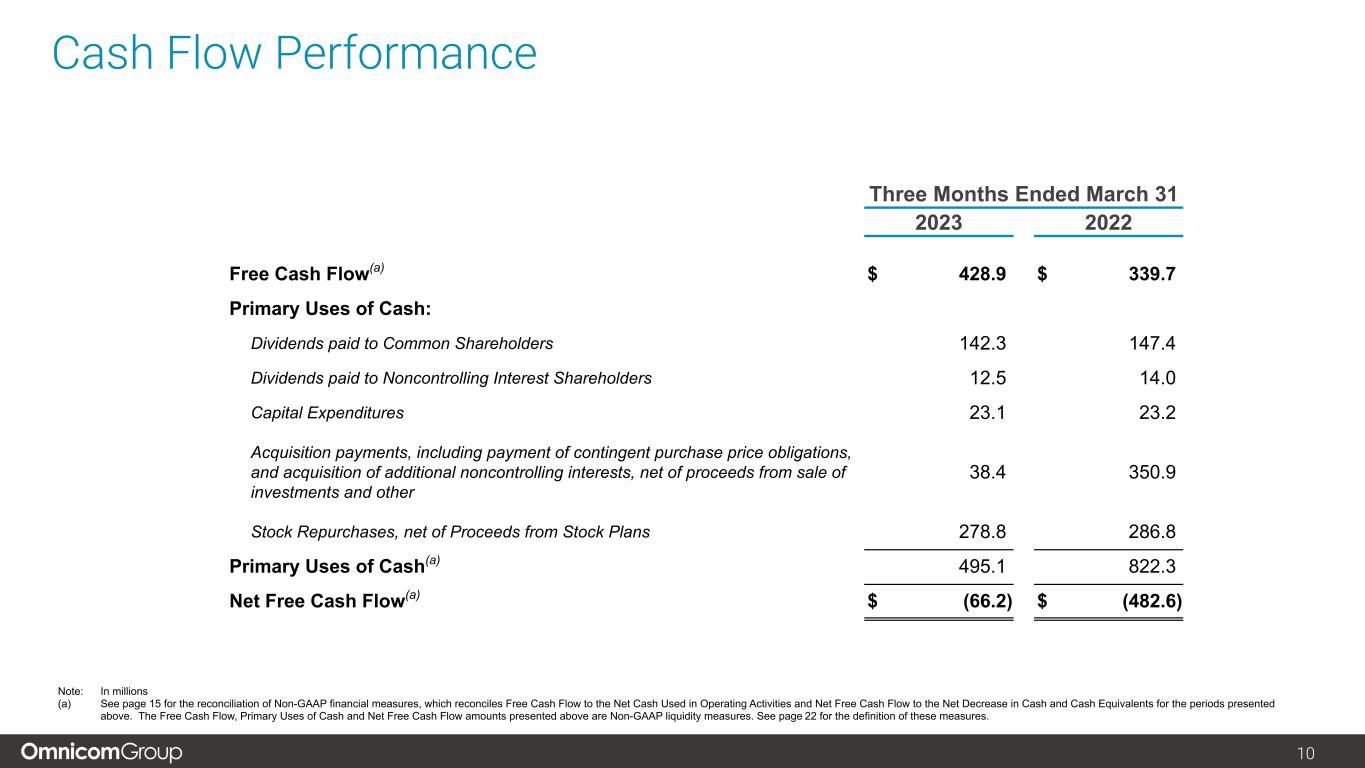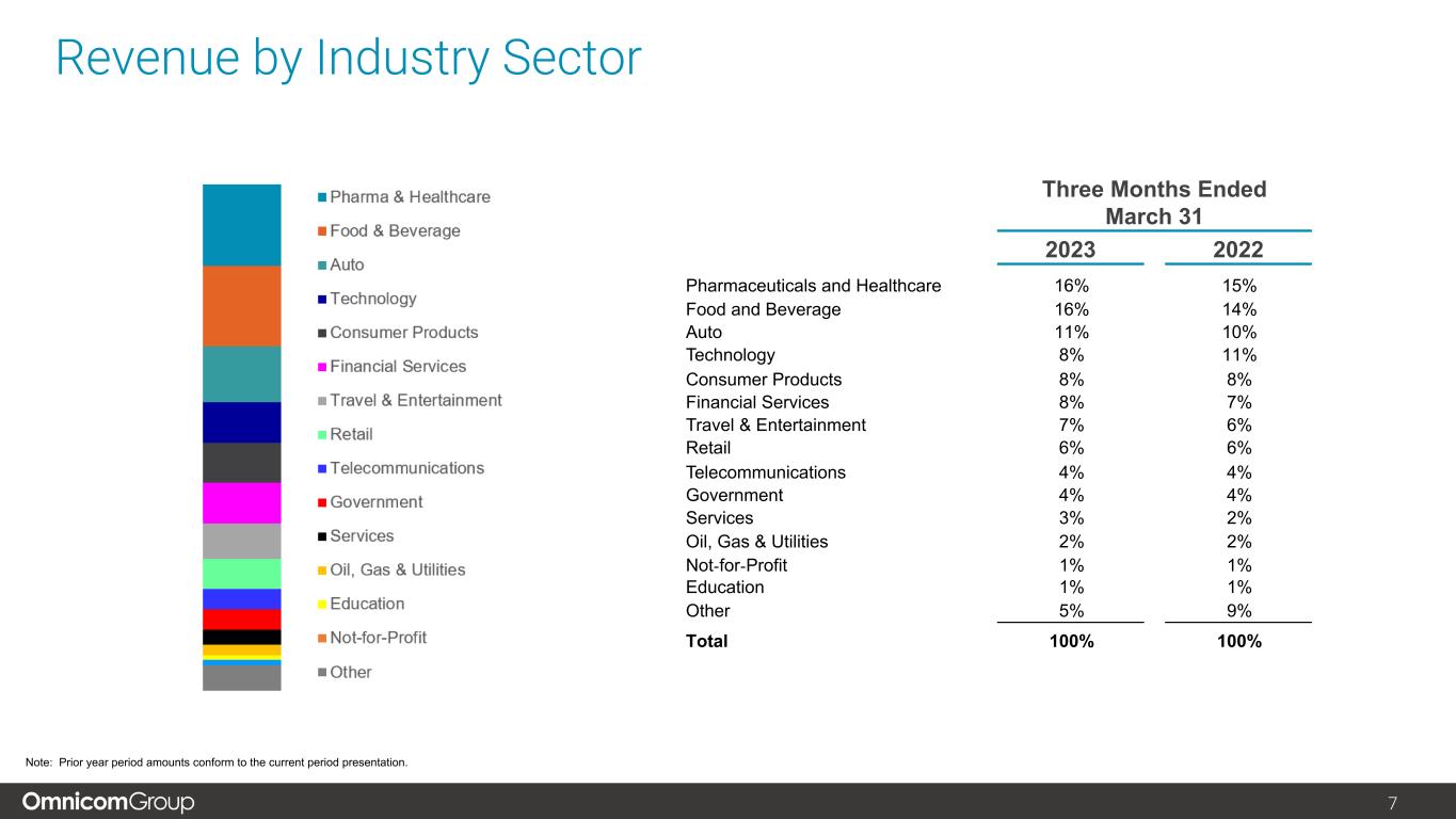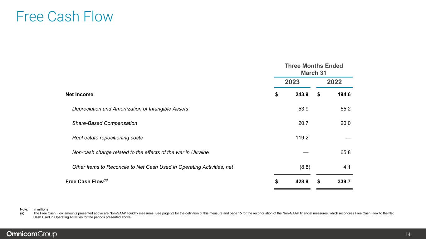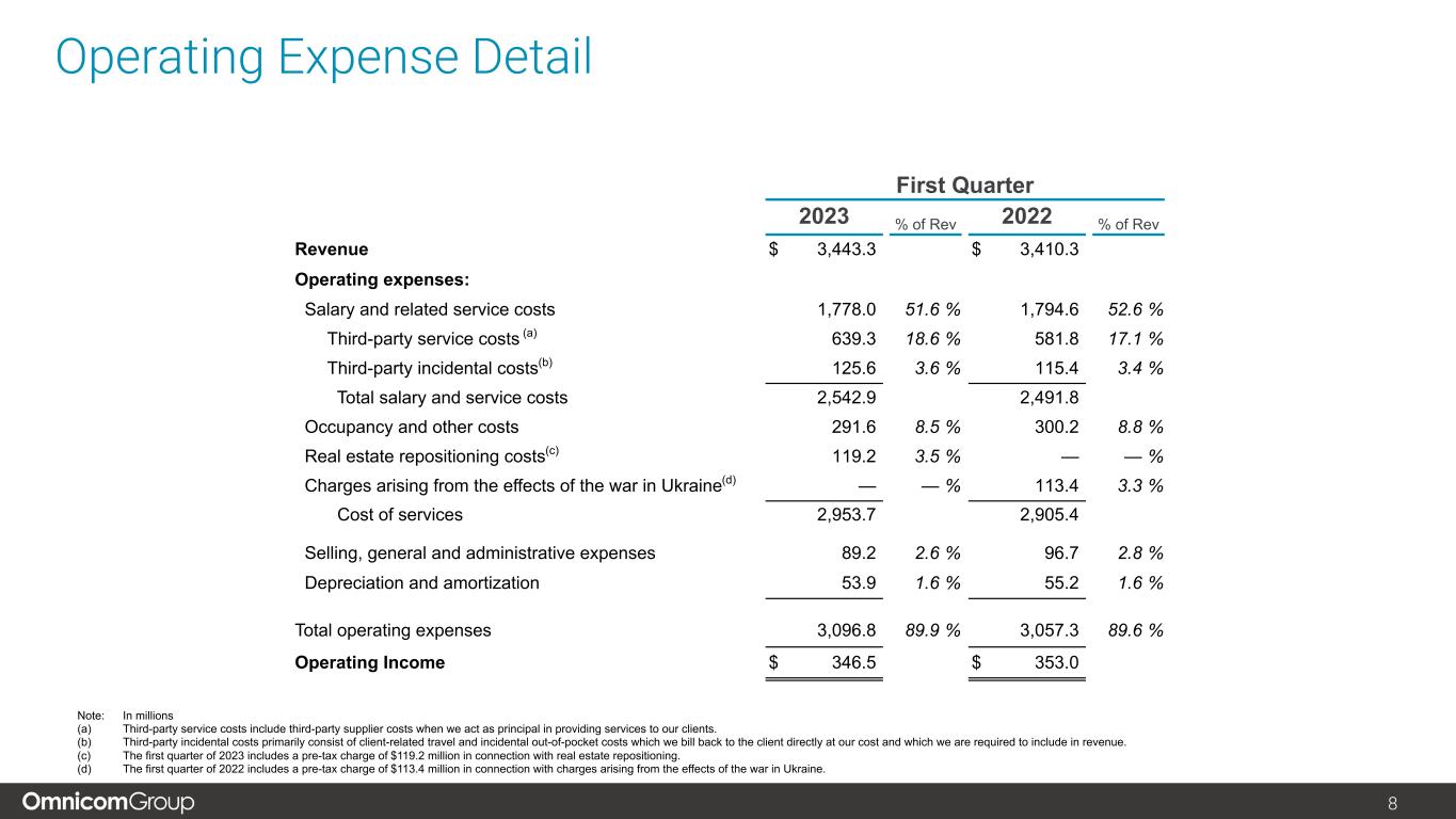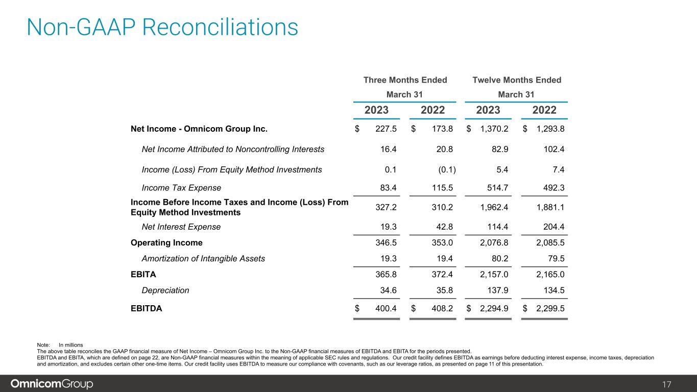 22 Disclosures The preceding materials have been prepared for use in the April 18, 2023 conference call on Omnicom’s results of operations for the three months ended March 31, 2023. The call will be archived on the Internet at http:// investor.omnicomgroup.com Forward-Looking Statements Certain statements in this press release constitute forward-looking statements, including statements within the meaning of the Private Securities Litigation Reform Act of 1995. In addition, from time to time, the Company or its representatives have made, or may make, forward-looking statements, orally or in writing. These statements may discuss goals, intentions and expectations as to future plans, trends, events, results of operations or financial position, or otherwise, based on current beliefs of the Company’s management as well as assumptions made by, and information currently available to, the Company’s management. Forward-looking statements may be accompanied by words such as “aim,” “anticipate,” “believe,” “plan,” “could,” “should,” “would,” “estimate,” “expect,” “forecast,” “future,” “guidance,” “intend,” “may,” “will,” “possible,” “potential,” “predict,” “project” or similar words, phrases or expressions. These forward-looking statements are subject to various risks and uncertainties, many of which are outside the Company’s control. Therefore, you should not place undue reliance on such statements. Factors that could cause actual results to differ materially from those in the forward-looking statements include: adverse economic conditions, including those caused by the war in Ukraine, the lingering effects of the COVID-19 pandemic, high and persistent inflation in countries that comprise our major markets, rising interest rates; supply chain issues affecting the distribution of our clients’ products; international, national or local economic conditions that could adversely affect the Company or its clients; losses on media purchases and production costs incurred on behalf of clients; reductions in client spending, a slowdown in client payments and a deterioration or a disruption in the credit markets; the ability to attract new clients and retain existing clients in the manner anticipated; changes in client advertising, marketing and corporate communications requirements; failure to manage potential conflicts of interest between or among clients; unanticipated changes related to competitive factors in the advertising, marketing and corporate communications industries; the ability to hire and retain key personnel; currency exchange rate fluctuations; reliance on information technology systems; changes in legislation or governmental regulations affecting the Company or its clients; risks associated with assumptions the Company makes in connection with its critical accounting estimates and legal proceedings; and the Company’s international operations, which are subject to the risks of currency repatriation restrictions, social or political conditions and regulatory environment; and risks related to our environmental, social and governance goals and initiatives, including impacts from regulators and other stakeholders, and the impact of factors outside of our control on such goals and initiatives. The foregoing list of factors is not exhaustive. You should carefully consider the foregoing factors and the other risks and uncertainties that may affect the Company’s business, including those described in Item 1A, “Risk Factors” and Item 7, “Management’s Discussion and Analysis of Financial Condition and Results of Operations” in our Annual Report on Form 10-K for the year ended December 31, 2022. Except as required under applicable law, the Company does not assume any obligation to update these forward-looking statements. Non-GAAP Financial Measures We present financial measures determined in accordance with generally accepted accounting principles in the United States (“GAAP”) and adjustments to the GAAP presentation (“Non-GAAP”), which we believe are meaningful for understanding our performance. EBITA is defined as operating income before interest, taxes, and amortization of intangible assets, and EBITA margin is defined as EBITA divided by revenue. We use EBITA and EBITA margin as additional operating performance measures, which exclude the non-cash amortization expense of intangible assets (primarily consisting of amortization arising from acquisitions). We also use Adjusted Operating Income, Adjusted Operating Income Margin, Adjusted EBITA, Adjusted EBITA Margin, Adjusted Income Tax Expense, Adjusted Net Income – Omnicom Group Inc. and Adjusted Net Income per diluted share – Omnicom Group Inc. as additional operating performance measures. We believe these measures are useful in evaluating the impact of certain items on operating performance and allow for comparability between reporting periods. Non-GAAP financial measures should not be considered in isolation from, or as a substitute for, financial information presented in compliance with GAAP. Non-GAAP financial measures as reported by us may not be comparable to similarly titled amounts reported by other companies. Other Information All dollar amounts are in millions except for per share figures. The information contained in this document has not been audited, although some data has been derived from Omnicom’s historical financial statements, including its audited financial statements. In addition, industry, operational and other non-financial data contained in this document have been derived from sources that we believe to be reliable, but we have not independently verified such information, and we do not, nor does any other person, assume responsibility for the accuracy or completeness of that information. Certain amounts in prior periods have been reclassified to conform to our current presentation. The inclusion of information 