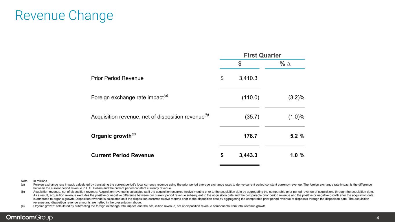 3 Three Months Ended March 31 Reported 2023 Non-GAAP Adjustments(a) Non-GAAP Adjusted 2023 Reported 2022 Non-GAAP Adjustments(b) Non-GAAP Adjusted 2022 Revenue $ 3,443.3 $ — $ 3,443.3 $ 3,410.3 $ — $ 3,410.3 Operating Expenses 3,096.8 (119.2) 2,977.6 3,057.3 (113.4) 2,943.9 Operating Income 346.5 119.2 465.7 353.0 113.4 466.4 Net Interest Expense 19.3 — 19.3 42.8 — 42.8 Income Tax Expense 83.4 28.2 111.6 115.5 (4.8) 110.7 Income from Equity Method Investments 0.1 — 0.1 (0.1) — (0.1) Net Income Attributed to Noncontrolling Interests 16.4 — 16.4 20.8 — 20.8 Net Income - Omnicom Group Inc.(a)(b) $ 227.5 $ 91.0 $ 318.5 $ 173.8 $ 118.2 $ 292.0 Diluted Shares 204.5 — 204.5 209.8 — 209.8 Net Income per Share - Diluted (a)(b) $ 1.11 $ 0.45 $ 1.56 $ 0.83 $ 0.56 $ 1.39 Income Statement Summary - Adjusted Note: In millions except per share amounts. See Non-GAAP reconciliations on page 18 and 19. Effective with the First quarter 2023 reporting, Operating Profit has been renamed Operating Income. a) First quarter 2023 operating expenses include $119.2 million ($91.0 million after tax), related to real estate repositioning costs, which reduced diluted net income per share - Omnicom Group Inc. by $0.45. b) First quarter 2022 operating expenses include $113.4 million ($118.2 million after tax), related to the change arising from the effects of the war in Ukraine, which reduced diluted net income per share - Omnicom Group Inc. by $0.56.