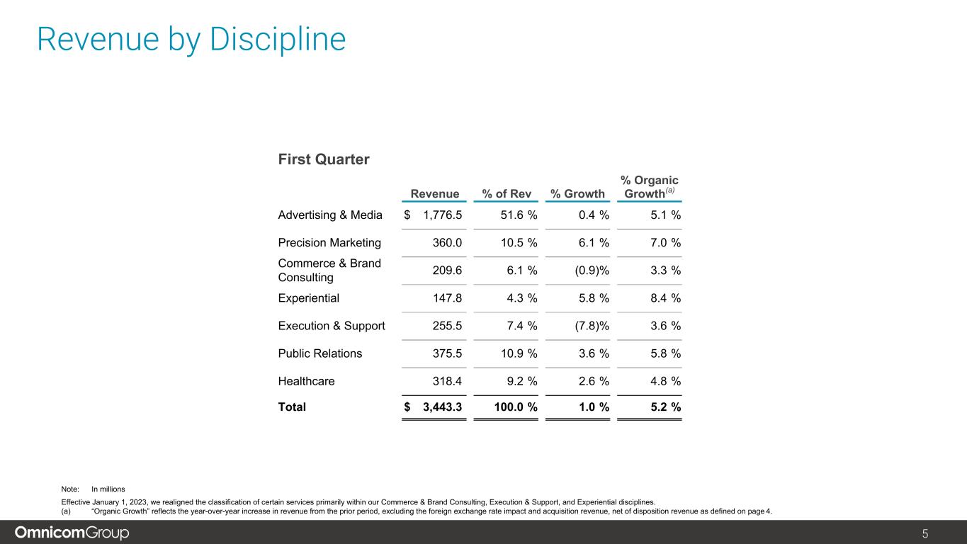 4 Revenue Change First Quarter $ % ∆ Prior Period Revenue $ 3,410.3 Foreign exchange rate impact(a) (110.0) (3.2) % Acquisition revenue, net of disposition revenue(b) (35.7) (1.0) % Organic growth(c) 178.7 5.2 % Current Period Revenue $ 3,443.3 1.0 % Note: In millions (a) Foreign exchange rate impact: calculated by translating the current period’s local currency revenue using the prior period average exchange rates to derive current period constant currency revenue. The foreign exchange rate impact is the difference between the current period revenue in U.S. Dollars and the current period constant currency revenue. (b) Acquisition revenue, net of disposition revenue: Acquisition revenue is calculated as if the acquisition occurred twelve months prior to the acquisition date by aggregating the comparable prior period revenue of acquisitions through the acquisition date. As a result, acquisition revenue excludes the positive or negative difference between our current period revenue subsequent to the acquisition date and the comparable prior period revenue and the positive or negative growth after the acquisition date is attributed to organic growth. Disposition revenue is calculated as if the disposition occurred twelve months prior to the disposition date by aggregating the comparable prior period revenue of disposals through the disposition date. The acquisition revenue and disposition revenue amounts are netted in the presentation above. (c) Organic growth: calculated by subtracting the foreign exchange rate impact, and the acquisition revenue, net of disposition revenue components from total revenue growth.