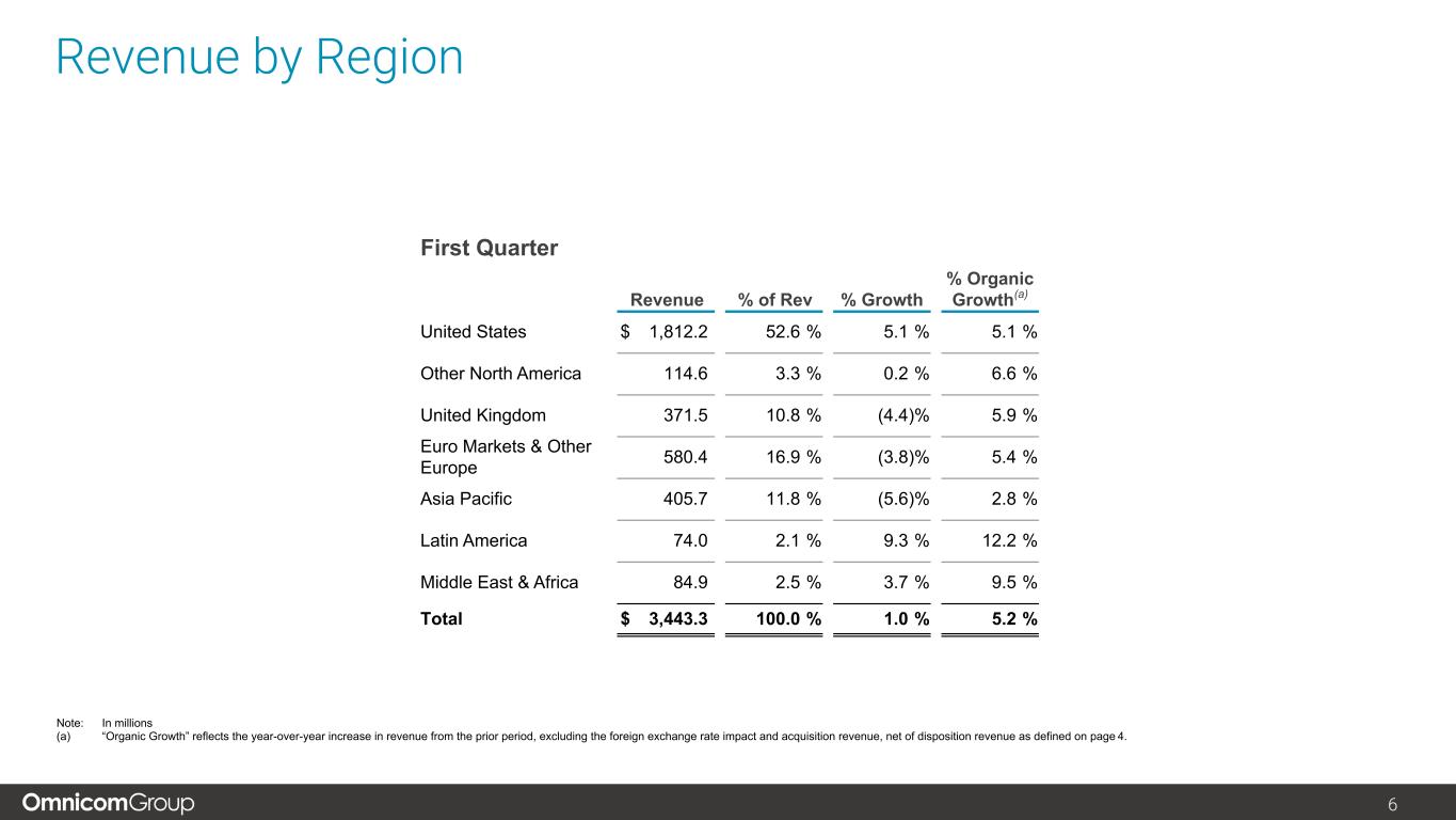 5 Revenue by Discipline First Quarter Revenue % of Rev % Growth % Organic Growth(a) Advertising & Media $ 1,776.5 51.6 % 0.4 % 5.1 % Precision Marketing 360.0 10.5 % 6.1 % 7.0 % Commerce & Brand Consulting 209.6 6.1 % (0.9) % 3.3 % Experiential 147.8 4.3 % 5.8 % 8.4 % Execution & Support 255.5 7.4 % (7.8) % 3.6 % Public Relations 375.5 10.9 % 3.6 % 5.8 % Healthcare 318.4 9.2 % 2.6 % 4.8 % Total $ 3,443.3 100.0 % 1.0 % 5.2 % Note: In millions Effective January 1, 2023, we realigned the classification of certain services primarily within our Commerce & Brand Consulting, Execution & Support, and Experiential disciplines. (a) “Organic Growth” reflects the year-over-year increase in revenue from the prior period, excluding the foreign exchange rate impact and acquisition revenue, net of disposition revenue as defined on page 4.