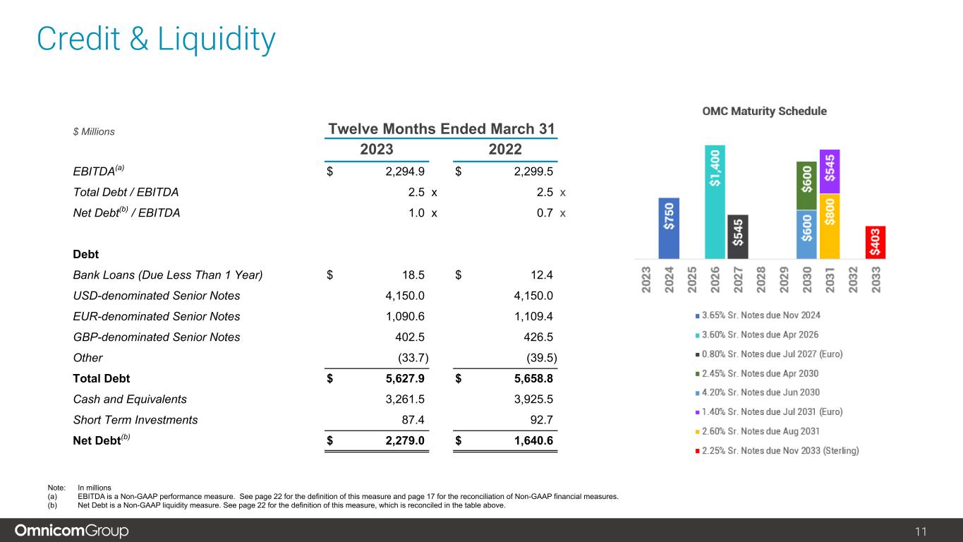 10 Cash Flow Performance Three Months Ended March 31 2023 2022 Free Cash Flow(a) $ 428.9 $ 339.7 Primary Uses of Cash: Dividends paid to Common Shareholders 142.3 147.4 Dividends paid to Noncontrolling Interest Shareholders 12.5 14.0 Capital Expenditures 23.1 23.2 Acquisition payments, including payment of contingent purchase price obligations, and acquisition of additional noncontrolling interests, net of proceeds from sale of investments and other 38.4 350.9 Stock Repurchases, net of Proceeds from Stock Plans 278.8 286.8 Primary Uses of Cash(a) 495.1 822.3 Net Free Cash Flow(a) $ (66.2) $ (482.6) Note: In millions (a) See page 15 for the reconciliation of Non-GAAP financial measures, which reconciles Free Cash Flow to the Net Cash Used in Operating Activities and Net Free Cash Flow to the Net Decrease in Cash and Cash Equivalents for the periods presented above. The Free Cash Flow, Primary Uses of Cash and Net Free Cash Flow amounts presented above are Non-GAAP liquidity measures. See page 22 for the definition of these measures.