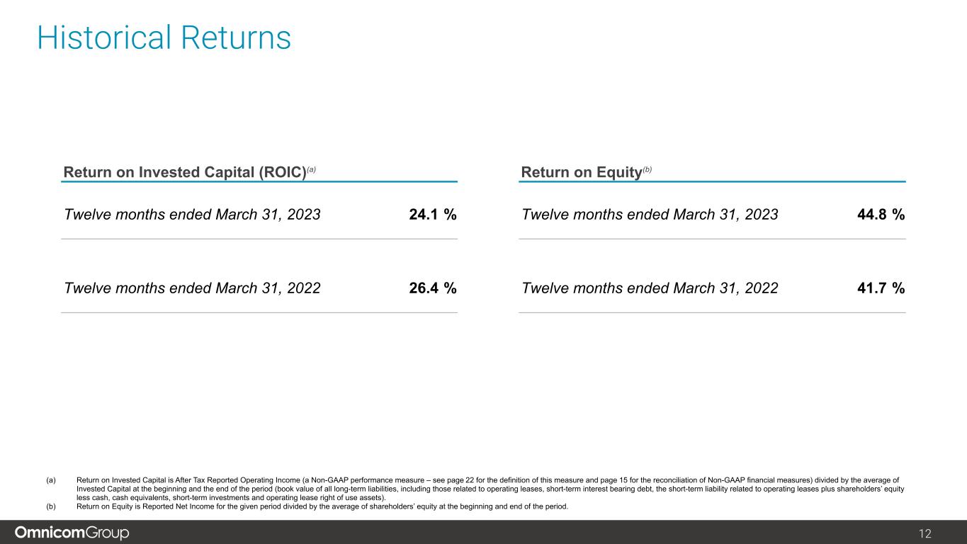 12 Historical Returns (a) Return on Invested Capital is After Tax Reported Operating Income (a Non-GAAP performance measure – see page 22 for the definition of this measure and page 15 for the reconciliation of Non-GAAP financial measures) divided by the average of Invested Capital at the beginning and the end of the period (book value of all long-term liabilities, including those related to operating leases, short-term interest bearing debt, the short-term liability related to operating leases plus shareholders’ equity less cash, cash equivalents, short-term investments and operating lease right of use assets). (b) Return on Equity is Reported Net Income for the given period divided by the average of shareholders’ equity at the beginning and end of the period. Return on Invested Capital (ROIC)(a) Return on Equity(b) Twelve months ended March 31, 2023 24.1 % Twelve months ended March 31, 2023 44.8 % Twelve months ended March 31, 2022 26.4 % Twelve months ended March 31, 2022 41.7 %