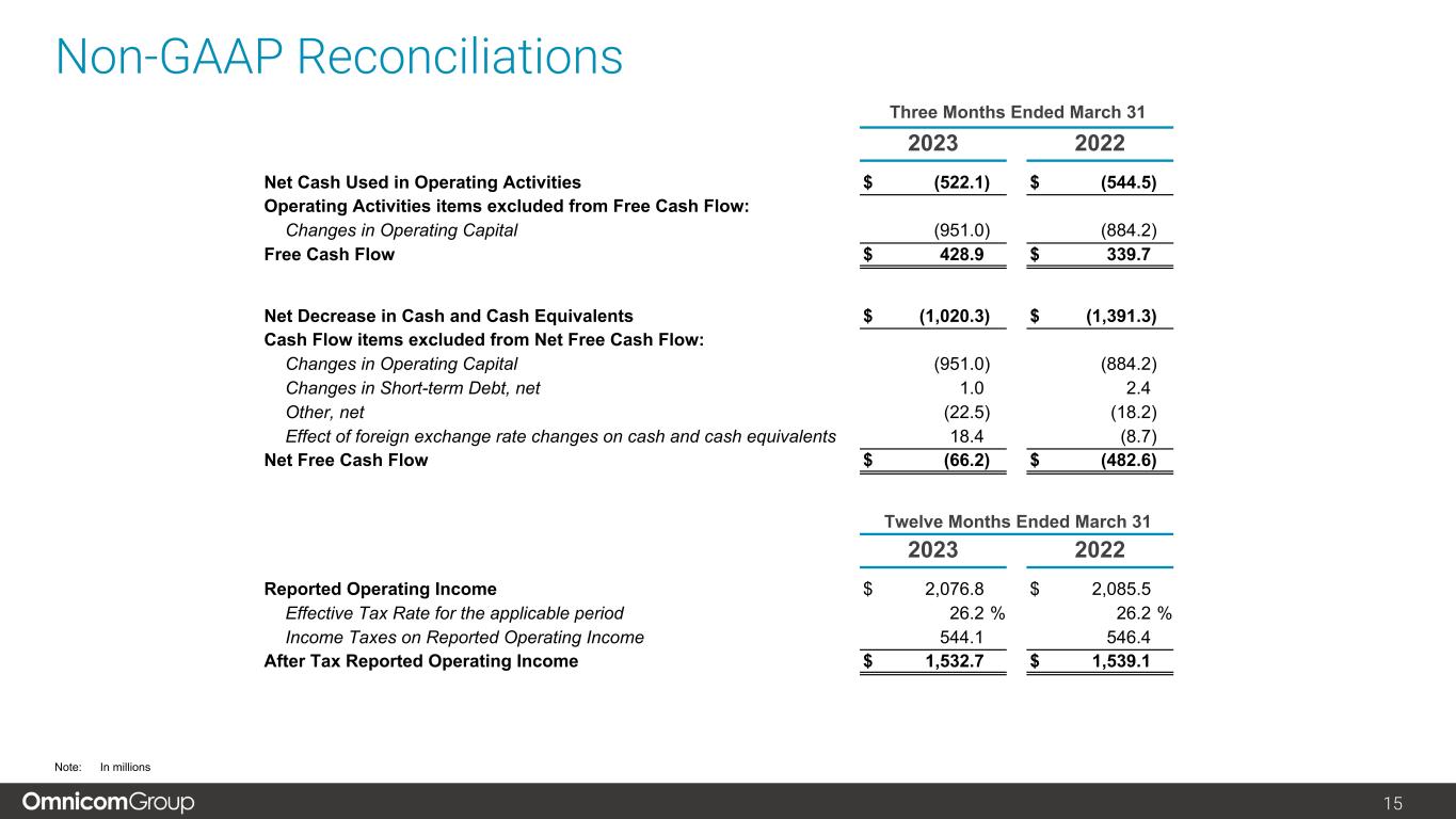 14 Free Cash Flow Note: In millions (a) The Free Cash Flow amounts presented above are Non-GAAP liquidity measures. See page 22 for the definition of this measure and page 15 for the reconciliation of the Non-GAAP financial measures, which reconciles Free Cash Flow to the Net Cash Used in Operating Activities for the periods presented above. Three Months Ended March 31 2023 2022 Net Income $ 243.9 $ 194.6 Depreciation and Amortization of Intangible Assets 53.9 55.2 Share-Based Compensation 20.7 20.0 Real estate repositioning costs 119.2 — Non-cash charge related to the effects of the war in Ukraine — 65.8 Other Items to Reconcile to Net Cash Used in Operating Activities, net (8.8) 4.1 Free Cash Flow(a) $ 428.9 $ 339.7