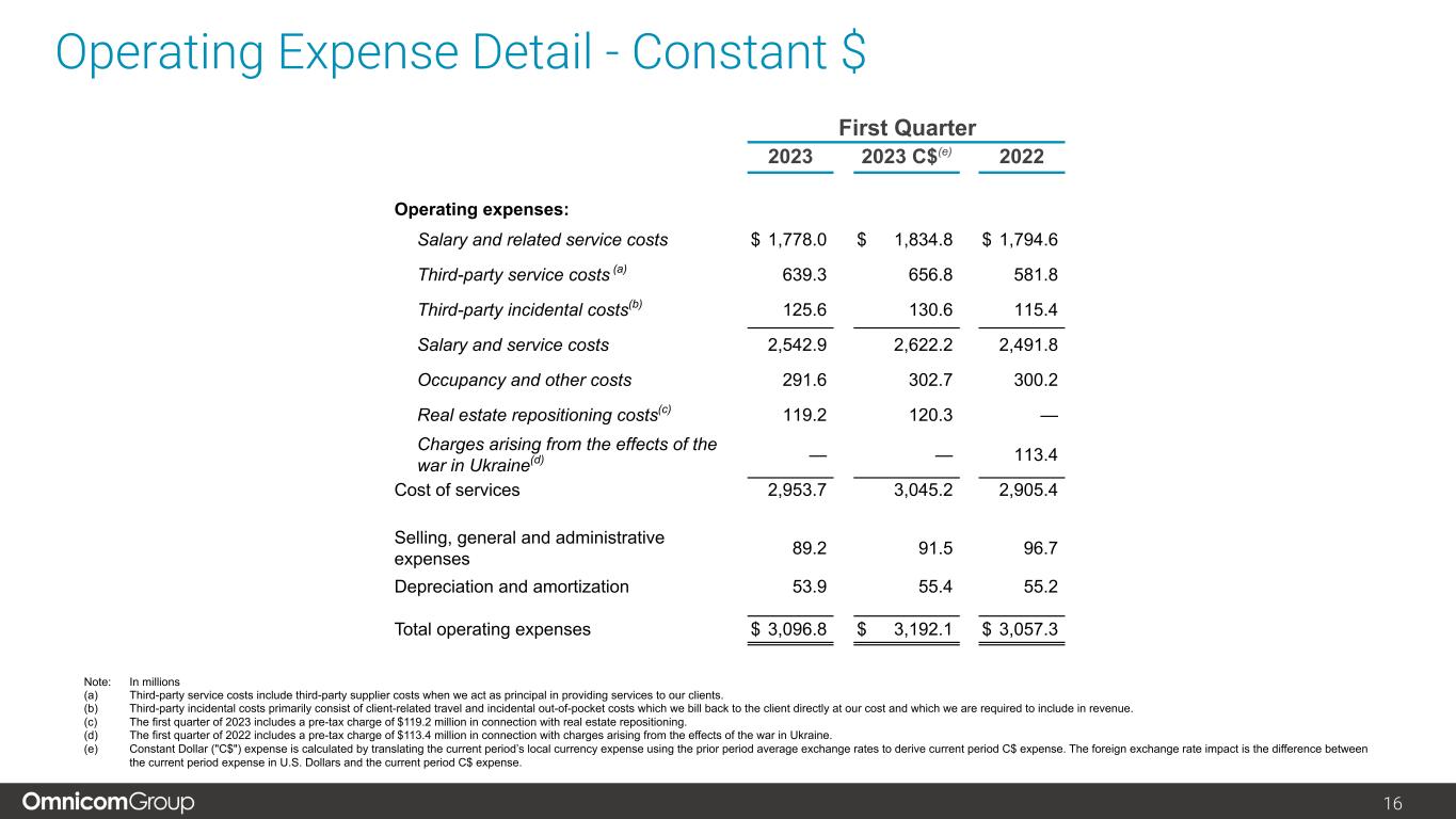 16 Operating Expense Detail - Constant $ First Quarter 2023 2023 C$(e) 2022 Operating expenses: Salary and related service costs $ 1,778.0 $ 1,834.8 $ 1,794.6 Third-party service costs (a) 639.3 656.8 581.8 Third-party incidental costs(b) 125.6 130.6 115.4 Salary and service costs 2,542.9 2,622.2 2,491.8 Occupancy and other costs 291.6 302.7 300.2 Real estate repositioning costs(c) 119.2 120.3 — Charges arising from the effects of the war in Ukraine(d) — — 113.4 Cost of services 2,953.7 3,045.2 2,905.4 Selling, general and administrative expenses 89.2 91.5 96.7 Depreciation and amortization 53.9 55.4 55.2 Total operating expenses $ 3,096.8 $ 3,192.1 $ 3,057.3 Note: In millions (a) Third-party service costs include third-party supplier costs when we act as principal in providing services to our clients. (b) Third-party incidental costs primarily consist of client-related travel and incidental out-of-pocket costs which we bill back to the client directly at our cost and which we are required to include in revenue. (c) The first quarter of 2023 includes a pre-tax charge of $119.2 million in connection with real estate repositioning. (d) The first quarter of 2022 includes a pre-tax charge of $113.4 million in connection with charges arising from the effects of the war in Ukraine. (e) Constant Dollar ("C$") expense is calculated by translating the current period’s local currency expense using the prior period average exchange rates to derive current period C$ expense. The foreign exchange rate impact is the difference between the current period expense in U.S. Dollars and the current period C$ expense.
