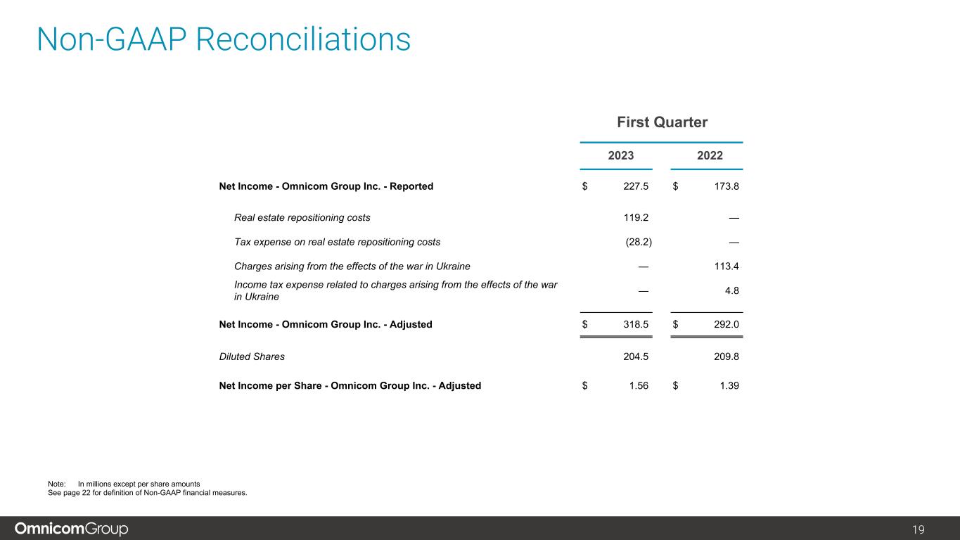 18 Non-GAAP Reconciliations Note: In millions The above table reconciles the GAAP financial measure of Net Income – Omnicom Group Inc. to the Non-GAAP financial measures of EBITA Adjusted and Operating Income Adjusted for the periods presented. Management believes that excluding the real estate repositioning costs and the charges arising from the effects of the war in Ukraine provides investors with a better picture of the performance of the business during the periods presented. EBITA, which is defined on page 22, is a Non-GAAP financial measures within the meaning of applicable SEC rules and regulations. Three Months Ended March 31, 2023 Non-GAAP Adjusted EBITA Operating Income Net Income - Omnicom Group Inc.- reported $ 227.5 $ 227.5 Net Income Attributed To Noncontrolling Interests 16.4 16.4 Income From Equity Method Investments 0.1 0.1 Income Tax Expense 83.4 83.4 Income Before Income Taxes and Income From Equity Method Investments 327.2 327.2 Net Interest Expense 19.3 19.3 Operating Income - Reported 346.5 346.5 Real estate repositioning costs 119.2 Charges arising from the effects of the war in Ukraine Non-GAAP Operating Income - Adjusted $ 465.7 Amortization of Intangible Assets 19.3 EBITA - Reported 365.8 Real estate repositioning costs 119.2 Charges arising from the effects of the war in Ukraine EBITA - Adjusted $ 485.0 Revenue - reported $ 3,443.3 $ 3,443.3 Margin 14.1 % 13.5 % Three Months Ended March 31, 2022 Non-GAAP Adjusted EBITA Operating Income $ 173.8 $ 173.8 20.8 20.8 (0.1) (0.1) 115.5 115.5 310.2 310.2 42.8 42.8 353.0 353.0 113.4 $ 466.4 19.4 372.4 113.4 $ 485.8 $ 3,410.3 $ 3,410.3 14.2 % 13.7 %