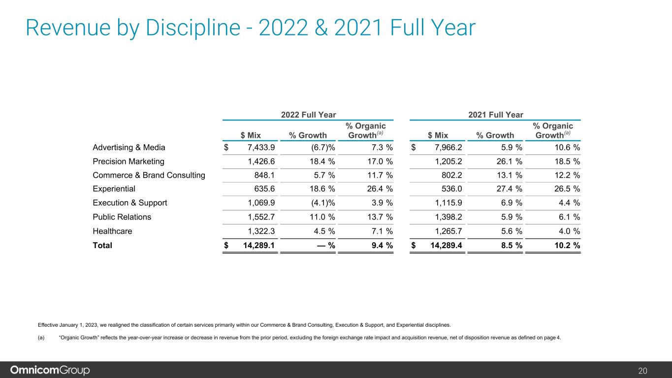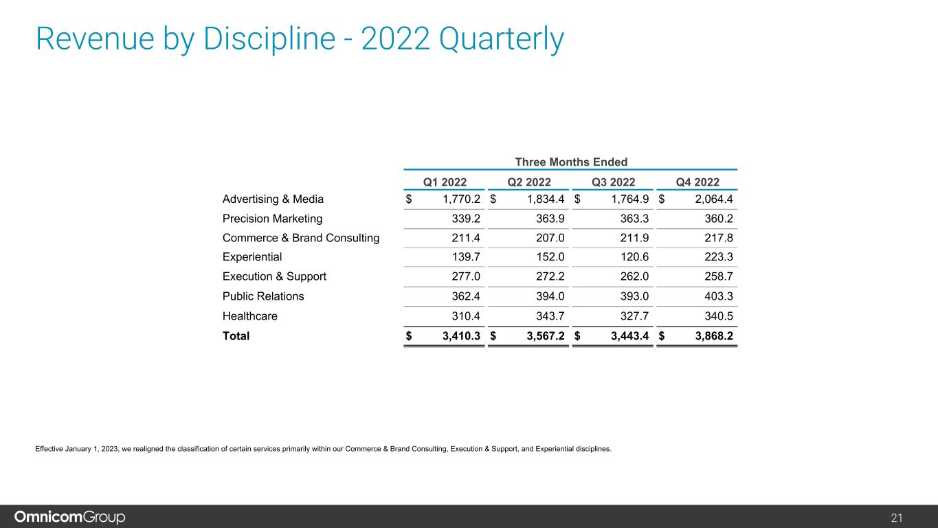 21 Revenue by Discipline - 2022 Quarterly Three Months Ended Q1 2022 Q2 2022 Q3 2022 Q4 2022 Advertising & Media $ 1,770.2 $ 1,834.4 $ 1,764.9 $ 2,064.4 Precision Marketing 339.2 363.9 363.3 360.2 Commerce & Brand Consulting 211.4 207.0 211.9 217.8 Experiential 139.7 152.0 120.6 223.3 Execution & Support 277.0 272.2 262.0 258.7 Public Relations 362.4 394.0 393.0 403.3 Healthcare 310.4 343.7 327.7 340.5 Total $ 3,410.3 $ 3,567.2 $ 3,443.4 $ 3,868.2 Effective January 1, 2023, we realigned the classification of certain services primarily within our Commerce & Brand Consulting, Execution & Support, and Experiential disciplines.