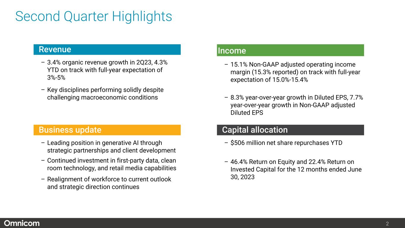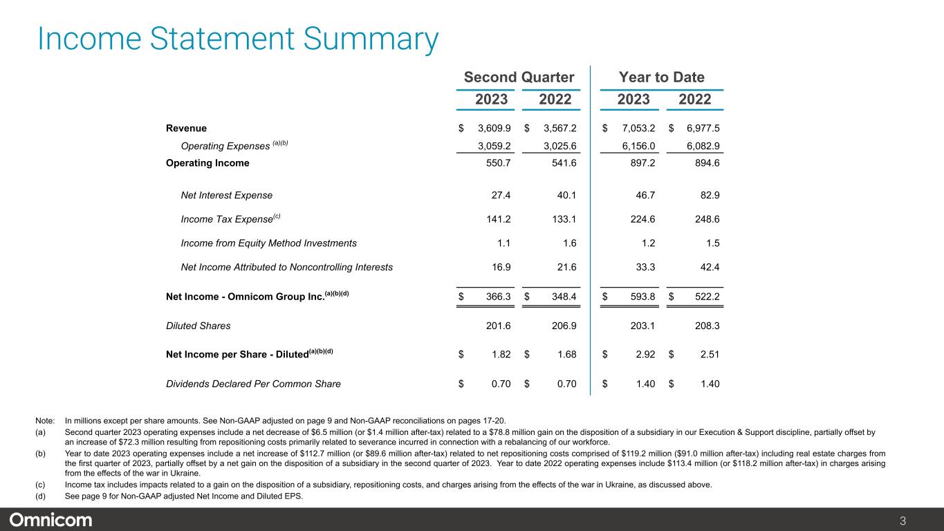 2 Second Quarter Highlights Revenue – 3.4% organic revenue growth in 2Q23, 4.3% YTD on track with full-year expectation of 3%-5% – Key disciplines performing solidly despite challenging macroeconomic conditions Income – 15.1% Non-GAAP adjusted operating income margin (15.3% reported) on track with full-year expectation of 15.0%-15.4% – 8.3% year-over-year growth in Diluted EPS, 7.7% year-over-year growth in Non-GAAP adjusted Diluted EPS Business update – Leading position in generative AI through strategic partnerships and client development – Continued investment in first-party data, clean room technology, and retail media capabilities – Realignment of workforce to current outlook and strategic direction continues Capital allocation – $506 million net share repurchases YTD – 46.4% Return on Equity and 22.4% Return on Invested Capital for the 12 months ended June 30, 2023