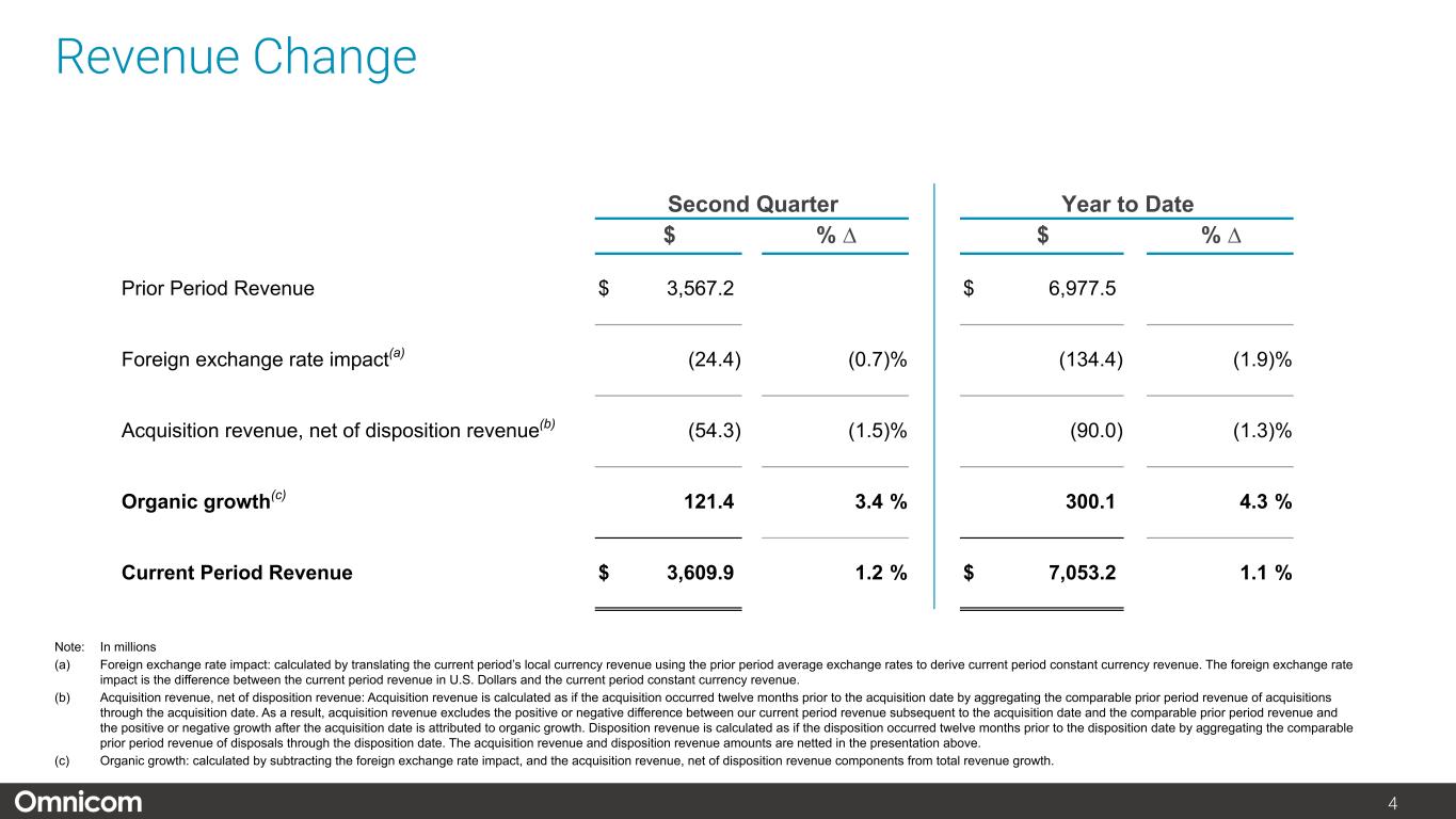 3 Second Quarter Year to Date 2023 2022 2023 2022 Revenue $ 3,609.9 $ 3,567.2 $ 7,053.2 $ 6,977.5 Operating Expenses (a)(b) 3,059.2 3,025.6 6,156.0 6,082.9 Operating Income 550.7 541.6 897.2 894.6 Net Interest Expense 27.4 40.1 46.7 82.9 Income Tax Expense(c) 141.2 133.1 224.6 248.6 Income from Equity Method Investments 1.1 1.6 1.2 1.5 Net Income Attributed to Noncontrolling Interests 16.9 21.6 33.3 42.4 Net Income - Omnicom Group Inc.(a)(b)(d) $ 366.3 $ 348.4 $ 593.8 $ 522.2 Diluted Shares 201.6 206.9 203.1 208.3 Net Income per Share - Diluted(a)(b)(d) $ 1.82 $ 1.68 $ 2.92 $ 2.51 Dividends Declared Per Common Share $ 0.70 $ 0.70 $ 1.40 $ 1.40 Income Statement Summary Note: In millions except per share amounts. See Non-GAAP adjusted on page 9 and Non-GAAP reconciliations on pages 17-20. (a) Second quarter 2023 operating expenses include a net decrease of $6.5 million (or $1.4 million after-tax) related to a $78.8 million gain on the disposition of a subsidiary in our Execution & Support discipline, partially offset by an increase of $72.3 million resulting from repositioning costs primarily related to severance incurred in connection with a rebalancing of our workforce. (b) Year to date 2023 operating expenses include a net increase of $112.7 million (or $89.6 million after-tax) related to net repositioning costs comprised of $119.2 million ($91.0 million after-tax) including real estate charges from the first quarter of 2023, partially offset by a net gain on the disposition of a subsidiary in the second quarter of 2023. Year to date 2022 operating expenses include $113.4 million (or $118.2 million after-tax) in charges arising from the effects of the war in Ukraine. (c) Income tax includes impacts related to a gain on the disposition of a subsidiary, repositioning costs, and charges arising from the effects of the war in Ukraine, as discussed above. (d) See page 9 for Non-GAAP adjusted Net Income and Diluted EPS.