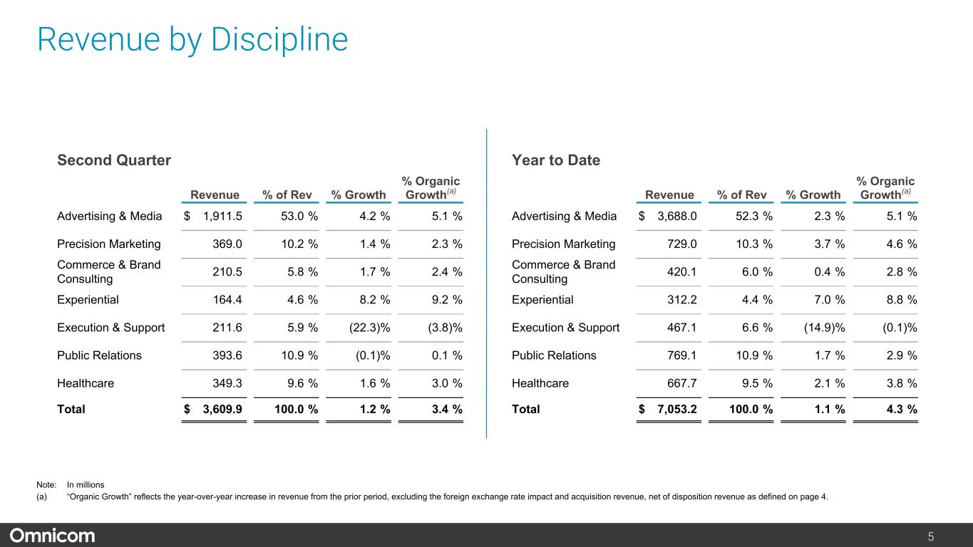 4 Revenue Change Second Quarter Year to Date $ % ∆ $ % ∆ Prior Period Revenue $ 3,567.2 $ 6,977.5 Foreign exchange rate impact(a) (24.4) (0.7) % (134.4) (1.9) % Acquisition revenue, net of disposition revenue(b) (54.3) (1.5) % (90.0) (1.3) % Organic growth(c) 121.4 3.4 % 300.1 4.3 % Current Period Revenue $ 3,609.9 1.2 % $ 7,053.2 1.1 % Note: In millions (a) Foreign exchange rate impact: calculated by translating the current period’s local currency revenue using the prior period average exchange rates to derive current period constant currency revenue. The foreign exchange rate impact is the difference between the current period revenue in U.S. Dollars and the current period constant currency revenue. (b) Acquisition revenue, net of disposition revenue: Acquisition revenue is calculated as if the acquisition occurred twelve months prior to the acquisition date by aggregating the comparable prior period revenue of acquisitions through the acquisition date. As a result, acquisition revenue excludes the positive or negative difference between our current period revenue subsequent to the acquisition date and the comparable prior period revenue and the positive or negative growth after the acquisition date is attributed to organic growth. Disposition revenue is calculated as if the disposition occurred twelve months prior to the disposition date by aggregating the comparable prior period revenue of disposals through the disposition date. The acquisition revenue and disposition revenue amounts are netted in the presentation above. (c) Organic growth: calculated by subtracting the foreign exchange rate impact, and the acquisition revenue, net of disposition revenue components from total revenue growth.