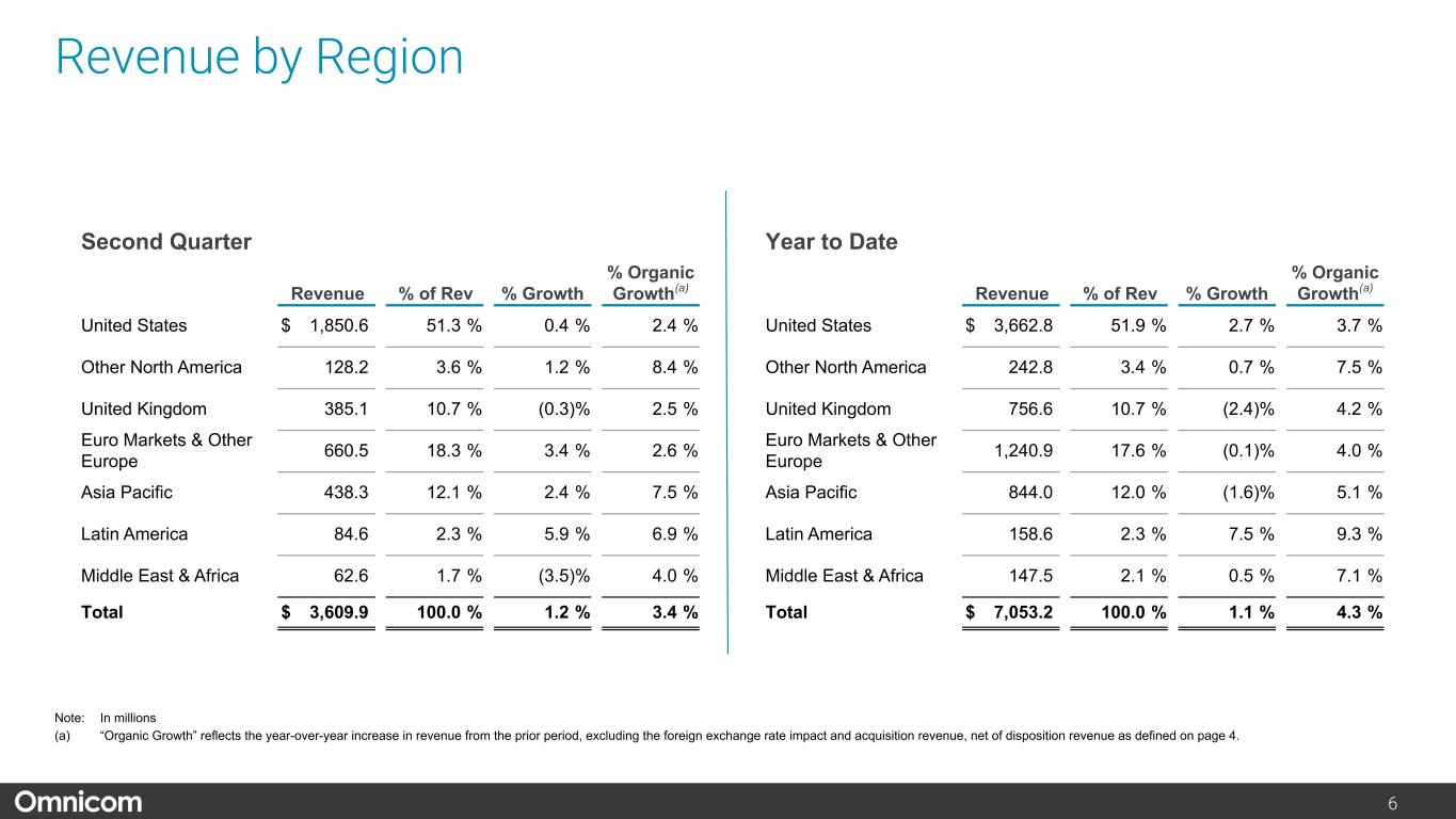 5 Revenue by Discipline Second Quarter Revenue % of Rev % Growth % Organic Growth(a) Advertising & Media $ 1,911.5 53.0 % 4.2 % 5.1 % Precision Marketing 369.0 10.2 % 1.4 % 2.3 % Commerce & Brand Consulting 210.5 5.8 % 1.7 % 2.4 % Experiential 164.4 4.6 % 8.2 % 9.2 % Execution & Support 211.6 5.9 % (22.3) % (3.8) % Public Relations 393.6 10.9 % (0.1) % 0.1 % Healthcare 349.3 9.6 % 1.6 % 3.0 % Total $ 3,609.9 100.0 % 1.2 % 3.4 % Note: In millions (a) “Organic Growth” reflects the year-over-year increase in revenue from the prior period, excluding the foreign exchange rate impact and acquisition revenue, net of disposition revenue as defined on page 4. Year to Date Revenue % of Rev % Growth % Organic Growth(a) Advertising & Media $ 3,688.0 52.3 % 2.3 % 5.1 % Precision Marketing 729.0 10.3 % 3.7 % 4.6 % Commerce & Brand Consulting 420.1 6.0 % 0.4 % 2.8 % Experiential 312.2 4.4 % 7.0 % 8.8 % Execution & Support 467.1 6.6 % (14.9) % (0.1) % Public Relations 769.1 10.9 % 1.7 % 2.9 % Healthcare 667.7 9.5 % 2.1 % 3.8 % Total $ 7,053.2 100.0 % 1.1 % 4.3 %
