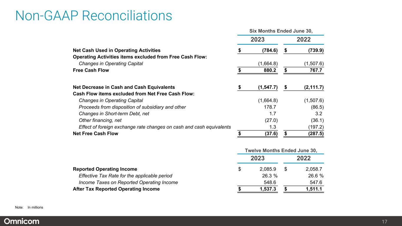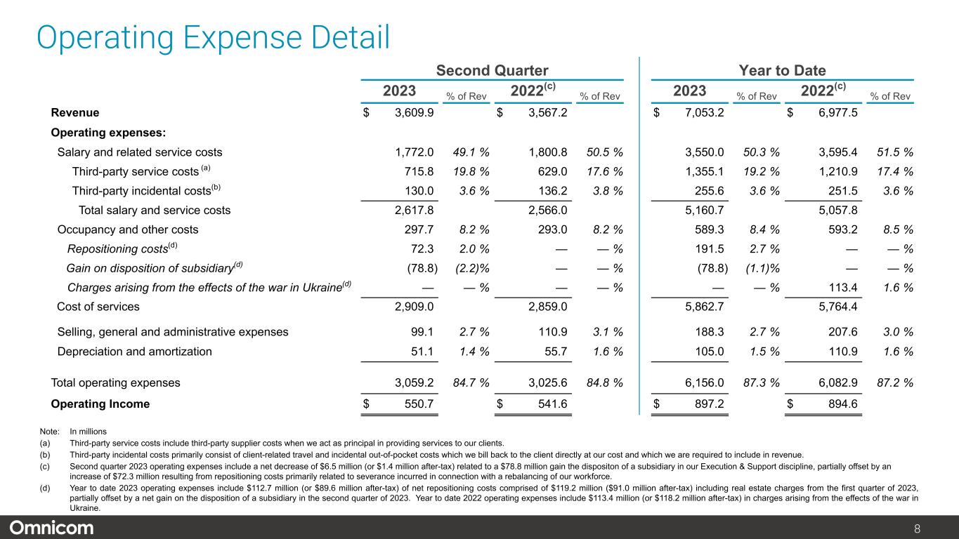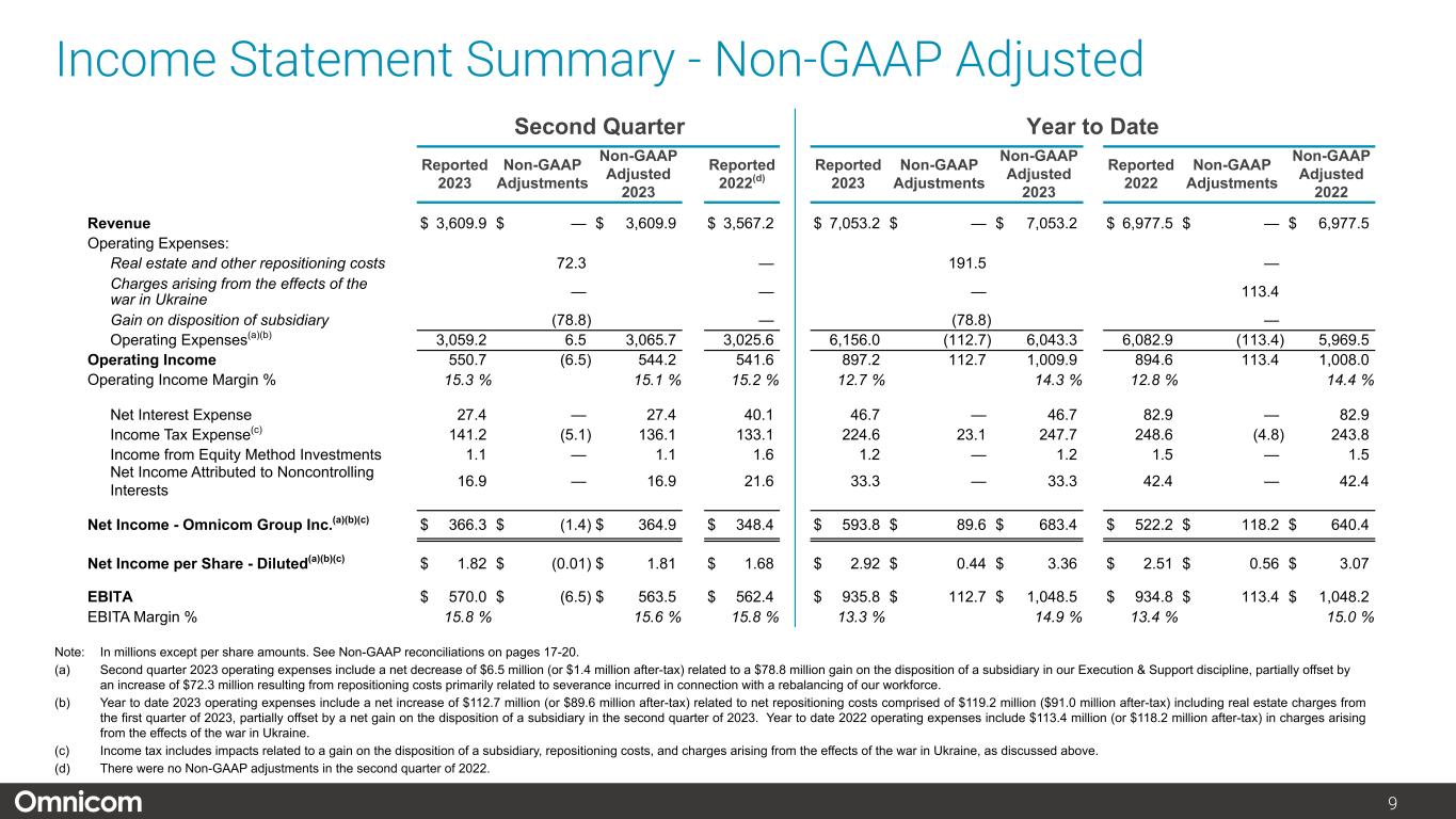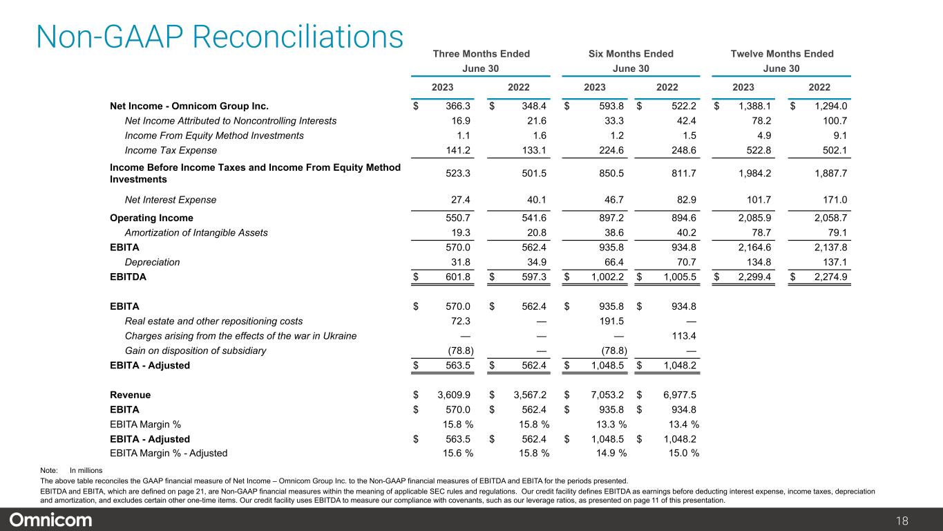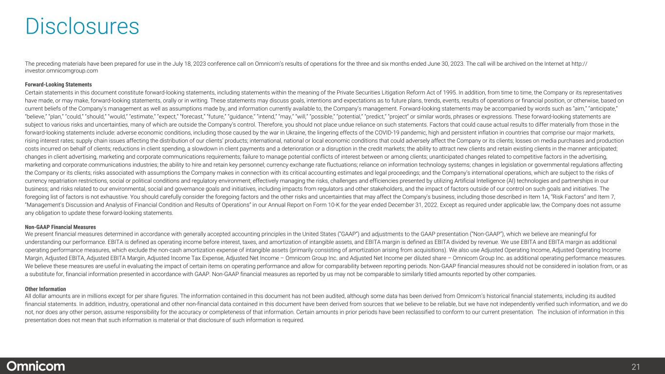 21 Disclosures The preceding materials have been prepared for use in the July 18, 2023 conference call on Omnicom’s results of operations for the three and six months ended June 30, 2023. The call will be archived on the Internet at http:// investor.omnicomgroup.com Forward-Looking Statements Certain statements in this document constitute forward-looking statements, including statements within the meaning of the Private Securities Litigation Reform Act of 1995. In addition, from time to time, the Company or its representatives have made, or may make, forward-looking statements, orally or in writing. These statements may discuss goals, intentions and expectations as to future plans, trends, events, results of operations or financial position, or otherwise, based on current beliefs of the Company’s management as well as assumptions made by, and information currently available to, the Company’s management. Forward-looking statements may be accompanied by words such as “aim,” “anticipate,” “believe,” “plan,” “could,” “should,” “would,” “estimate,” “expect,” “forecast,” “future,” “guidance,” “intend,” “may,” “will,” “possible,” “potential,” “predict,” “project” or similar words, phrases or expressions. These forward-looking statements are subject to various risks and uncertainties, many of which are outside the Company’s control. Therefore, you should not place undue reliance on such statements. Factors that could cause actual results to differ materially from those in the forward-looking statements include: adverse economic conditions, including those caused by the war in Ukraine, the lingering effects of the COVID-19 pandemic, high and persistent inflation in countries that comprise our major markets, rising interest rates; supply chain issues affecting the distribution of our clients’ products; international, national or local economic conditions that could adversely affect the Company or its clients; losses on media purchases and production costs incurred on behalf of clients; reductions in client spending, a slowdown in client payments and a deterioration or a disruption in the credit markets; the ability to attract new clients and retain existing clients in the manner anticipated; changes in client advertising, marketing and corporate communications requirements; failure to manage potential conflicts of interest between or among clients; unanticipated changes related to competitive factors in the advertising, marketing and corporate communications industries; the ability to hire and retain key personnel; currency exchange rate fluctuations; reliance on information technology systems; changes in legislation or governmental regulations affecting the Company or its clients; risks associated with assumptions the Company makes in connection with its critical accounting estimates and legal proceedings; and the Company’s international operations, which are subject to the risks of currency repatriation restrictions, social or political conditions and regulatory environment; effectively managing the risks, challenges and efficiencies presented by utilizing Artificial Intelligence (AI) technologies and partnerships in our business; and risks related to our environmental, social and governance goals and initiatives, including impacts from regulators and other stakeholders, and the impact of factors outside of our control on such goals and initiatives. The foregoing list of factors is not exhaustive. You should carefully consider the foregoing factors and the other risks and uncertainties that may affect the Company’s business, including those described in Item 1A, “Risk Factors” and Item 7, “Management’s Discussion and Analysis of Financial Condition and Results of Operations” in our Annual Report on Form 10-K for the year ended December 31, 2022. Except as required under applicable law, the Company does not assume any obligation to update these forward-looking statements. Non-GAAP Financial Measures We present financial measures determined in accordance with generally accepted accounting principles in the United States (“GAAP”) and adjustments to the GAAP presentation (“Non-GAAP”), which we believe are meaningful for understanding our performance. EBITA is defined as operating income before interest, taxes, and amortization of intangible assets, and EBITA margin is defined as EBITA divided by revenue. We use EBITA and EBITA margin as additional operating performance measures, which exclude the non-cash amortization expense of intangible assets (primarily consisting of amortization arising from acquisitions). We also use Adjusted Operating Income, Adjusted Operating Income Margin, Adjusted EBITA, Adjusted EBITA Margin, Adjusted Income Tax Expense, Adjusted Net Income – Omnicom Group Inc. and Adjusted Net Income per diluted share – Omnicom Group Inc. as additional operating performance measures. We believe these measures are useful in evaluating the impact of certain items on operating performance and allow for comparability between reporting periods. Non-GAAP financial measures should not be considered in isolation from, or as a substitute for, financial information presented in accordance with GAAP. Non-GAAP financial measures as reported by us may not be comparable to similarly titled amounts reported by other companies. Other Information All dollar amounts are in millions except for per share figures. The information contained in this document has not been audited, although some data has been derived from Omnicom’s historical financial statements, including its audited financial statements. In addition, industry, operational and other non-financial data contained in this document have been derived from sources that we believe to be reliable, but we have not independently verified such information, and we do not, nor does any other person, assume responsibility for the accuracy or