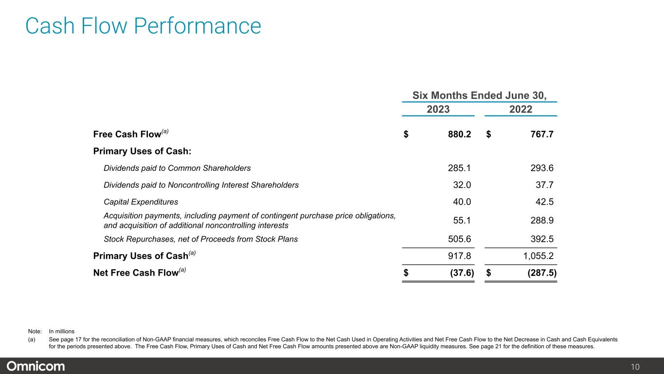 9 Second Quarter Year to Date Reported 2023 Non-GAAP Adjustments Non-GAAP Adjusted 2023 Reported 2022(d) Reported 2023 Non-GAAP Adjustments Non-GAAP Adjusted 2023 Reported 2022 Non-GAAP Adjustments Non-GAAP Adjusted 2022 Revenue $ 3,609.9 $ — $ 3,609.9 $ 3,567.2 $ 7,053.2 $ — $ 7,053.2 $ 6,977.5 $ — $ 6,977.5 Operating Expenses: Real estate and other repositioning costs 72.3 — 191.5 — Charges arising from the effects of the war in Ukraine — — — 113.4 Gain on disposition of subsidiary (78.8) — (78.8) — Operating Expenses(a)(b) 3,059.2 6.5 3,065.7 3,025.6 6,156.0 (112.7) 6,043.3 6,082.9 (113.4) 5,969.5 Operating Income 550.7 (6.5) 544.2 541.6 897.2 112.7 1,009.9 894.6 113.4 1,008.0 Operating Income Margin % 15.3 % 15.1 % 15.2 % 12.7 % 14.3 % 12.8 % 14.4 % Net Interest Expense 27.4 — 27.4 40.1 46.7 — 46.7 82.9 — 82.9 Income Tax Expense(c) 141.2 (5.1) 136.1 133.1 224.6 23.1 247.7 248.6 (4.8) 243.8 Income from Equity Method Investments 1.1 — 1.1 1.6 1.2 — 1.2 1.5 — 1.5 Net Income Attributed to Noncontrolling Interests 16.9 — 16.9 21.6 33.3 — 33.3 42.4 — 42.4 Net Income - Omnicom Group Inc.(a)(b)(c) $ 366.3 $ (1.4) $ 364.9 $ 348.4 $ 593.8 $ 89.6 $ 683.4 $ 522.2 $ 118.2 $ 640.4 Net Income per Share - Diluted(a)(b)(c) $ 1.82 $ (0.01) $ 1.81 $ 1.68 $ 2.92 $ 0.44 $ 3.36 $ 2.51 $ 0.56 $ 3.07 EBITA $ 570.0 $ (6.5) $ 563.5 $ 562.4 $ 935.8 $ 112.7 $ 1,048.5 $ 934.8 $ 113.4 $ 1,048.2 EBITA Margin % 15.8 % 15.6 % 15.8 % 13.3 % 14.9 % 13.4 % 15.0 % Income Statement Summary - Non-GAAP Adjusted Note: In millions except per share amounts. See Non-GAAP reconciliations on pages 17-20. (a) Second quarter 2023 operating expenses include a net decrease of $6.5 million (or $1.4 million after-tax) related to a $78.8 million gain on the disposition of a subsidiary in our Execution & Support discipline, partially offset by an increase of $72.3 million resulting from repositioning costs primarily related to severance incurred in connection with a rebalancing of our workforce. (b) Year to date 2023 operating expenses include a net increase of $112.7 million (or $89.6 million after-tax) related to net repositioning costs comprised of $119.2 million ($91.0 million after-tax) including real estate charges from the first quarter of 2023, partially offset by a net gain on the disposition of a subsidiary in the second quarter of 2023. Year to date 2022 operating expenses include $113.4 million (or $118.2 million after-tax) in charges arising from the effects of the war in Ukraine. (c) Income tax includes impacts related to a gain on the disposition of a subsidiary, repositioning costs, and charges arising from the effects of the war in Ukraine, as discussed above. (d) There were no Non-GAAP adjustments in the second quarter of 2022.