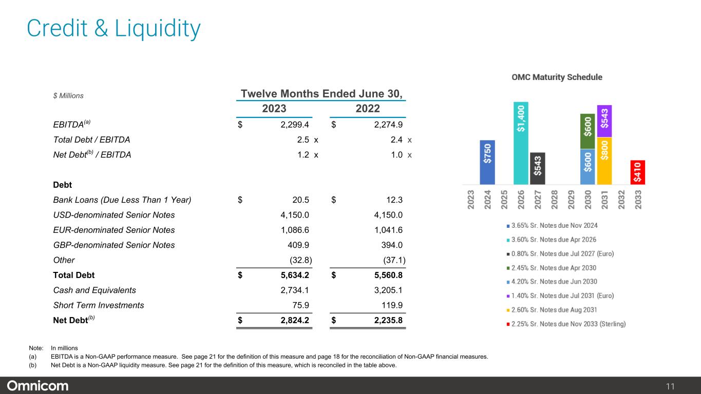 10 Cash Flow Performance Six Months Ended June 30, 2023 2022 Free Cash Flow(a) $ 880.2 $ 767.7 Primary Uses of Cash: Dividends paid to Common Shareholders 285.1 293.6 Dividends paid to Noncontrolling Interest Shareholders 32.0 37.7 Capital Expenditures 40.0 42.5 Acquisition payments, including payment of contingent purchase price obligations, and acquisition of additional noncontrolling interests 55.1 288.9 Stock Repurchases, net of Proceeds from Stock Plans 505.6 392.5 Primary Uses of Cash(a) 917.8 1,055.2 Net Free Cash Flow(a) $ (37.6) $ (287.5) Note: In millions (a) See page 17 for the reconciliation of Non-GAAP financial measures, which reconciles Free Cash Flow to the Net Cash Used in Operating Activities and Net Free Cash Flow to the Net Decrease in Cash and Cash Equivalents for the periods presented above. The Free Cash Flow, Primary Uses of Cash and Net Free Cash Flow amounts presented above are Non-GAAP liquidity measures. See page 21 for the definition of these measures.