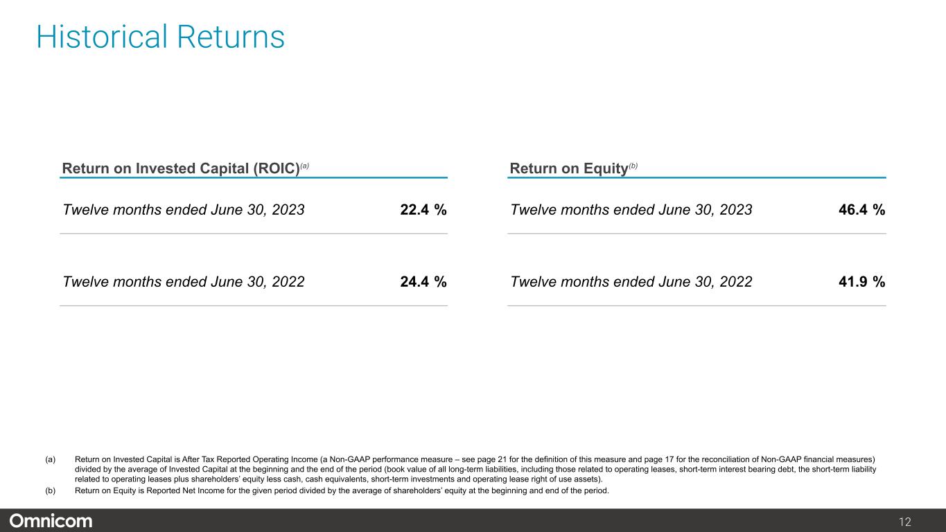 11 Credit & Liquidity $ Millions Twelve Months Ended June 30, 2023 2022 EBITDA(a) $ 2,299.4 $ 2,274.9 Total Debt / EBITDA 2.5 x 2.4 x Net Debt(b) / EBITDA 1.2 x 1.0 x Debt Bank Loans (Due Less Than 1 Year) $ 20.5 $ 12.3 USD-denominated Senior Notes 4,150.0 4,150.0 EUR-denominated Senior Notes 1,086.6 1,041.6 GBP-denominated Senior Notes 409.9 394.0 Other (32.8) (37.1) Total Debt $ 5,634.2 $ 5,560.8 Cash and Equivalents 2,734.1 3,205.1 Short Term Investments 75.9 119.9 Net Debt(b) $ 2,824.2 $ 2,235.8 Note: In millions (a) EBITDA is a Non-GAAP performance measure. See page 21 for the definition of this measure and page 18 for the reconciliation of Non-GAAP financial measures. (b) Net Debt is a Non-GAAP liquidity measure. See page 21 for the definition of this measure, which is reconciled in the table above.