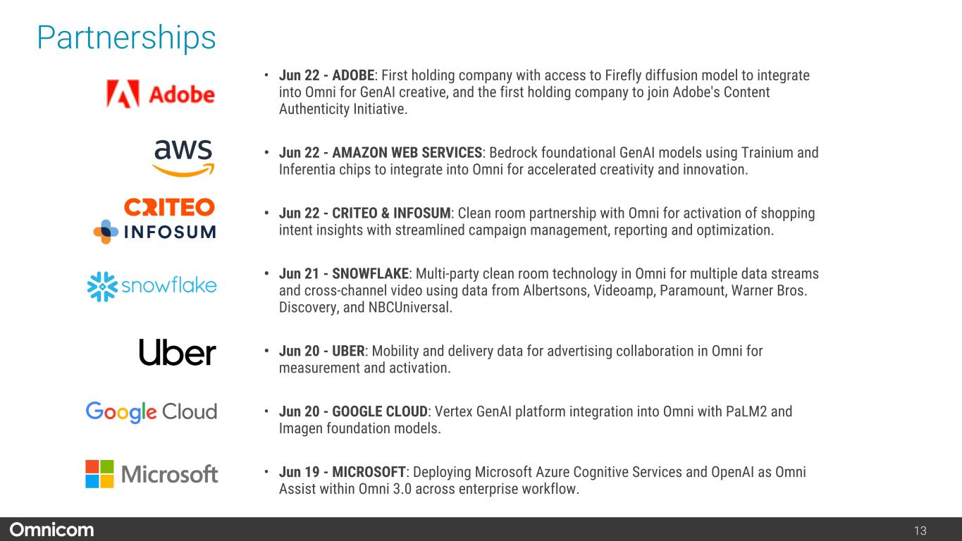 13 Partnerships • Jun 22 - ADOBE: First holding company with access to Firefly diffusion model to integrate into Omni for GenAI creative, and the first holding company to join Adobe's Content Authenticity Initiative. • Jun 22 - AMAZON WEB SERVICES: Bedrock foundational GenAI models using Trainium and Inferentia chips to integrate into Omni for accelerated creativity and innovation. • Jun 22 - CRITEO & INFOSUM: Clean room partnership with Omni for activation of shopping intent insights with streamlined campaign management, reporting and optimization. • Jun 21 - SNOWFLAKE: Multi-party clean room technology in Omni for multiple data streams and cross-channel video using data from Albertsons, Videoamp, Paramount, Warner Bros. Discovery, and NBCUniversal. • Jun 20 - UBER: Mobility and delivery data for advertising collaboration in Omni for measurement and activation. • Jun 20 - GOOGLE CLOUD: Vertex GenAI platform integration into Omni with PaLM2 and Imagen foundation models. • Jun 19 - MICROSOFT: Deploying Microsoft Azure Cognitive Services and OpenAI as Omni Assist within Omni 3.0 across enterprise workflow.