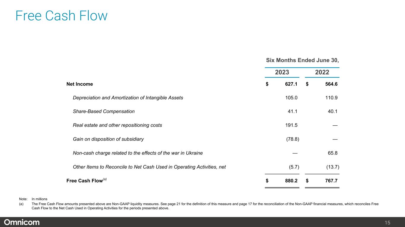 20 Second Quarter Year to Date 2023 2022 2023 2022 Net Income - Omnicom Group Inc. - Reported $ 366.3 $ 348.4 $ 593.8 $ 522.2 Impact on Net Income related to: Real estate and other repositioning costs 54.5 — 145.5 — Charges arising from the effects of the war in Ukraine — — — 118.2 Gain on disposition of subsidiary (55.9) — (55.9) — Net Income - Omnicom Group Inc. - Adjusted $ 364.9 $ 348.4 $ 683.4 $ 640.4 Diluted Shares 201.6 206.9 203.1 208.3 Net Income per Share - Omnicom Group Inc. - Adjusted $ 1.81 $ 1.68 $ 3.36 $ 3.07 Non-GAAP Reconciliations Note: In millions except per share amounts The above table reconciles GAAP Net Income to Non-GAAP adjusted Net Income and Adjusted Diluted Net Income per Share - Omnicom Group Inc. - Adjusted, adjusted for a gain on the disposition of a subsidiary and real estate and other repositioning costs in 2023 and the charges arising from the effects of the war in Ukraine in 2022. See page 21 for definition of Non-GAAP financial measures.