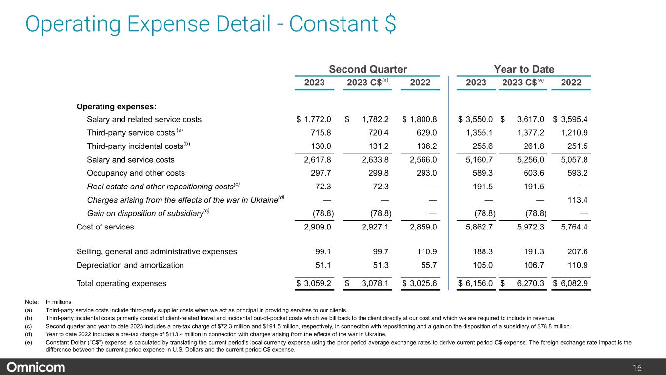 16 Operating Expense Detail - Constant $ Second Quarter Year to Date 2023 2023 C$(e) 2022 2023 2023 C$(e) 2022 Operating expenses: Salary and related service costs $ 1,772.0 $ 1,782.2 $ 1,800.8 $ 3,550.0 $ 3,617.0 $ 3,595.4 Third-party service costs (a) 715.8 720.4 629.0 1,355.1 1,377.2 1,210.9 Third-party incidental costs(b) 130.0 131.2 136.2 255.6 261.8 251.5 Salary and service costs 2,617.8 2,633.8 2,566.0 5,160.7 5,256.0 5,057.8 Occupancy and other costs 297.7 299.8 293.0 589.3 603.6 593.2 Real estate and other repositioning costs(c) 72.3 72.3 — 191.5 191.5 — Charges arising from the effects of the war in Ukraine(d) — — — — — 113.4 Gain on disposition of subsidiary(c) (78.8) (78.8) — (78.8) (78.8) — Cost of services 2,909.0 2,927.1 2,859.0 5,862.7 5,972.3 5,764.4 Selling, general and administrative expenses 99.1 99.7 110.9 188.3 191.3 207.6 Depreciation and amortization 51.1 51.3 55.7 105.0 106.7 110.9 Total operating expenses $ 3,059.2 $ 3,078.1 $ 3,025.6 $ 6,156.0 $ 6,270.3 $ 6,082.9 Note: In millions (a) Third-party service costs include third-party supplier costs when we act as principal in providing services to our clients. (b) Third-party incidental costs primarily consist of client-related travel and incidental out-of-pocket costs which we bill back to the client directly at our cost and which we are required to include in revenue. (c) Second quarter and year to date 2023 includes a pre-tax charge of $72.3 million and $191.5 million, respectively, in connection with repositioning and a gain on the disposition of a subsidiary of $78.8 million. (d) Year to date 2022 includes a pre-tax charge of $113.4 million in connection with charges arising from the effects of the war in Ukraine. (e) Constant Dollar ("C$") expense is calculated by translating the current period’s local currency expense using the prior period average exchange rates to derive current period C$ expense. The foreign exchange rate impact is the difference between the current period expense in U.S. Dollars and the current period C$ expense.