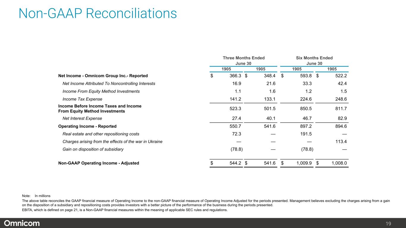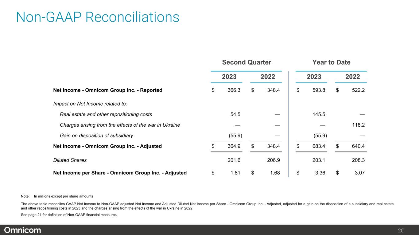 19 Non-GAAP Reconciliations Note: In millions The above table reconciles the GAAP financial measure of Operating Income to the non-GAAP financial measure of Operating Income Adjusted for the periods presented. Management believes excluding the charges arising from a gain on the disposition of a subsidiary and repositioning costs provides investors with a better picture of the performance of the business during the periods presented. EBITA, which is defined on page 21, is a Non-GAAP financial measures within the meaning of applicable SEC rules and regulations. Three Months Ended Six Months Ended June 30 June 30 1905 1905 1905 1905 Net Income - Omnicom Group Inc.- Reported $ 366.3 $ 348.4 $ 593.8 $ 522.2 Net Income Attributed To Noncontrolling Interests 16.9 21.6 33.3 42.4 Income From Equity Method Investments 1.1 1.6 1.2 1.5 Income Tax Expense 141.2 133.1 224.6 248.6 Income Before Income Taxes and Income From Equity Method Investments 523.3 501.5 850.5 811.7 Net Interest Expense 27.4 40.1 46.7 82.9 Operating Income - Reported 550.7 541.6 897.2 894.6 Real estate and other repositioning costs 72.3 — 191.5 — Charges arising from the effects of the war in Ukraine — — — 113.4 Gain on disposition of subsidiary (78.8) — (78.8) — Non-GAAP Operating Income - Adjusted $ 544.2 $ 541.6 $ 1,009.9 $ 1,008.0