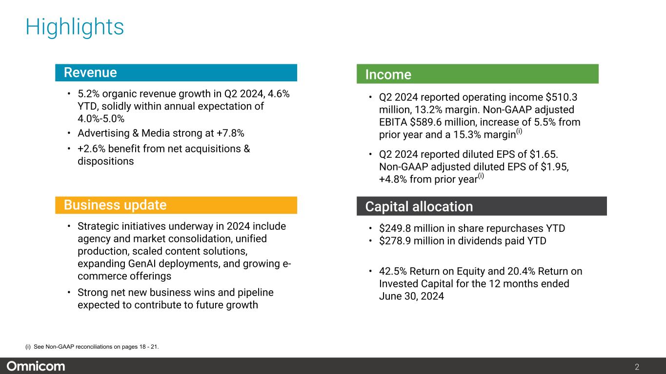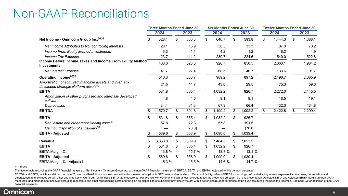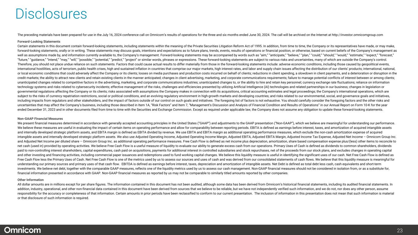 23 Disclosures The preceding materials have been prepared for use in the July 16, 2024 conference call on Omnicom’s results of operations for the three and six months ended June 30, 2024. The call will be archived on the Internet at http://investor.omnicomgroup.com Forward-Looking Statements Certain statements in this document contain forward-looking statements, including statements within the meaning of the Private Securities Litigation Reform Act of 1995. In addition, from time to time, the Company or its representatives have made, or may make, forward-looking statements, orally or in writing. These statements may discuss goals, intentions and expectations as to future plans, trends, events, results of operations or financial position, or otherwise, based on current beliefs of the Company’s management as well as assumptions made by, and information currently available to, the Company’s management. Forward-looking statements may be accompanied by words such as “aim,” “anticipate,” “believe,” “plan,” “could,” “should,” “would,” “estimate,” “expect,” “forecast,” “future,” “guidance,” “intend,” “may,” “will,” “possible,” “potential,” “predict,” “project” or similar words, phrases or expressions. These forward-looking statements are subject to various risks and uncertainties, many of which are outside the Company’s control. Therefore, you should not place undue reliance on such statements. Factors that could cause actual results to differ materially from those in the forward-looking statements include: adverse economic conditions, including those caused by geopolitical events, international hostilities, acts of terrorism, public health crises, high and sustained inflation in countries that comprise our major markets, high interest rates, and labor and supply chain issues affecting the distribution of our clients’ products; international, national, or local economic conditions that could adversely affect the Company or its clients; losses on media purchases and production costs incurred on behalf of clients; reductions in client spending, a slowdown in client payments, and a deterioration or disruption in the credit markets; the ability to attract new clients and retain existing clients in the manner anticipated; changes in client advertising, marketing, and corporate communications requirements; failure to manage potential conflicts of interest between or among clients; unanticipated changes related to competitive factors in the advertising, marketing, and corporate communications industries; unanticipated changes to, or the ability to hire and retain key personnel; currency exchange rate fluctuations; reliance on information technology systems and risks related to cybersecurity incidents; effective management of the risks, challenges and efficiencies presented by utilizing Artificial Intelligence (AI) technologies and related partnerships in our business; changes in legislation or governmental regulations affecting the Company or its clients; risks associated with assumptions the Company makes in connection with its acquisitions, critical accounting estimates and legal proceedings; the Company’s international operations, which are subject to the risks of currency repatriation restrictions, social or political conditions, and an evolving regulatory environment in high-growth markets and developing countries; and risks related to our environmental, social, and governance goals and initiatives, including impacts from regulators and other stakeholders, and the impact of factors outside of our control on such goals and initiatives. The foregoing list of factors is not exhaustive. You should carefully consider the foregoing factors and the other risks and uncertainties that may affect the Company’s business, including those described in Item 1A, “Risk Factors” and Item 7, “Management’s Discussion and Analysis of Financial Condition and Results of Operations” in our Annual Report on Form 10-K for the year ended December 31, 2023 and in other documents filed from time to time with the Securities and Exchange Commission. Except as required under applicable law, the Company does not assume any obligation to update these forward-looking statements. Non-GAAP Financial Measures We present financial measures determined in accordance with generally accepted accounting principles in the United States (“GAAP”) and adjustments to the GAAP presentation (“Non-GAAP”), which we believe are meaningful for understanding our performance. We believe these measures are useful in evaluating the impact of certain items on operating performance and allow for comparability between reporting periods. EBITA is defined as earnings before interest, taxes, and amortization of acquired intangible assets and internally developed strategic platform assets, and EBITA margin is defined as EBITA divided by revenue. We use EBITA and EBITA margin as additional operating performance measures, which exclude the non-cash amortization expense of acquired intangible assets and internally developed strategic platform assets. We also use Adjusted Operating Income, Adjusted Operating Income Margin, Adjusted EBITA, Adjusted EBITA Margin, Adjusted Income Tax Expense, Adjusted Net Income – Omnicom Group Inc. and Adjusted Net Income per diluted share – Omnicom Group Inc. as additional operating performance measures. Free Cash Flow is defined as net income plus depreciation, amortization, share based compensation expense plus/(less) other items to reconcile to net cash (used in) provided by operating activities. We believe Free Cash Flow is a useful measure of liquidity to evaluate our ability to generate excess cash from our operations. Primary Uses of Cash is defined as dividends to common shareholders, dividends paid to non-controlling interest shareholders, capital expenditures, cash paid on acquisitions, payments for additional 