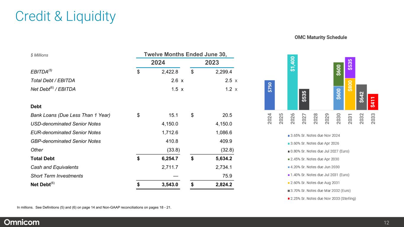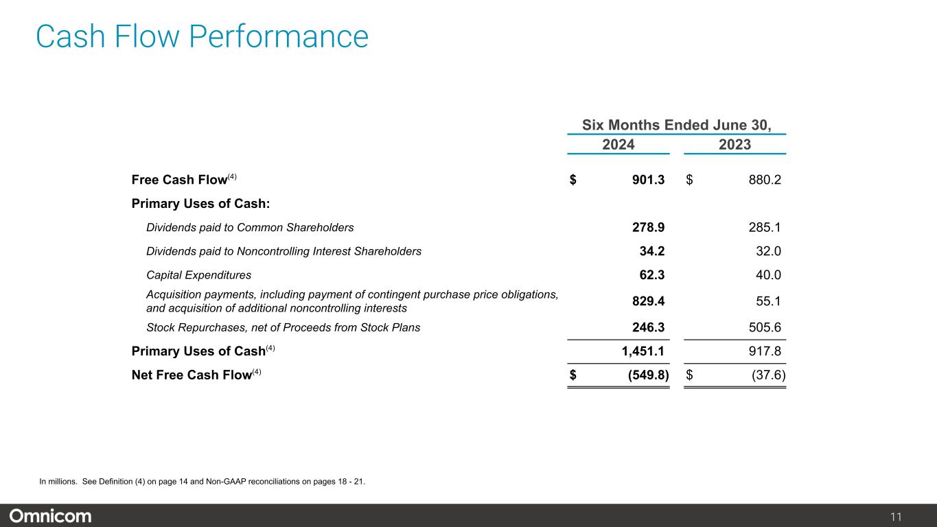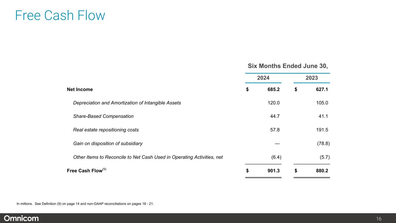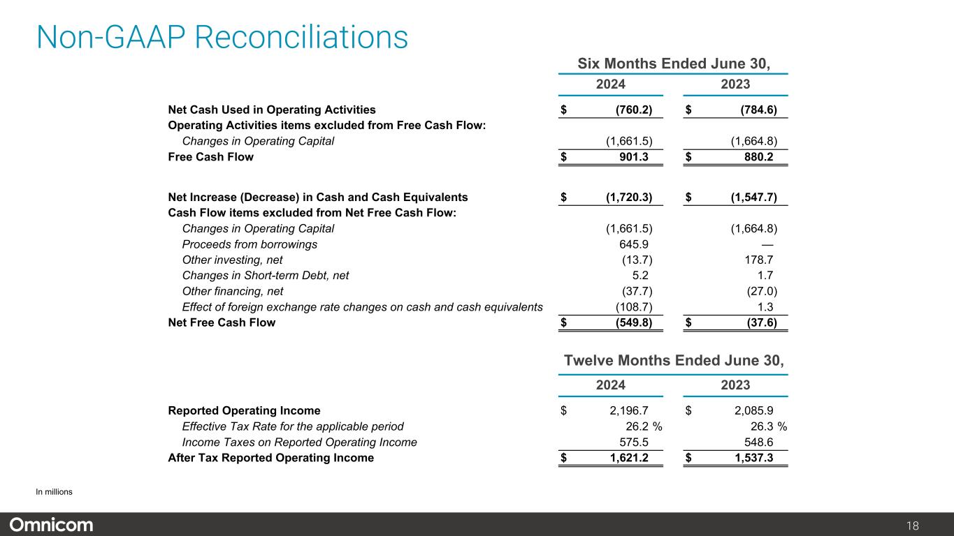 23 Disclosures The preceding materials have been prepared for use in the July 16, 2024 conference call on Omnicom’s results of operations for the three and six months ended June 30, 2024. The call will be archived on the Internet at http://investor.omnicomgroup.com Forward-Looking Statements Certain statements in this document contain forward-looking statements, including statements within the meaning of the Private Securities Litigation Reform Act of 1995. In addition, from time to time, the Company or its representatives have made, or may make, forward-looking statements, orally or in writing. These statements may discuss goals, intentions and expectations as to future plans, trends, events, results of operations or financial position, or otherwise, based on current beliefs of the Company’s management as well as assumptions made by, and information currently available to, the Company’s management. Forward-looking statements may be accompanied by words such as “aim,” “anticipate,” “believe,” “plan,” “could,” “should,” “would,” “estimate,” “expect,” “forecast,” “future,” “guidance,” “intend,” “may,” “will,” “possible,” “potential,” “predict,” “project” or similar words, phrases or expressions. These forward-looking statements are subject to various risks and uncertainties, many of which are outside the Company’s control. Therefore, you should not place undue reliance on such statements. Factors that could cause actual results to differ materially from those in the forward-looking statements include: adverse economic conditions, including those caused by geopolitical events, international hostilities, acts of terrorism, public health crises, high and sustained inflation in countries that comprise our major markets, high interest rates, and labor and supply chain issues affecting the distribution of our clients’ products; international, national, or local economic conditions that could adversely affect the Company or its clients; losses on media purchases and production costs incurred on behalf of clients; reductions in client spending, a slowdown in client payments, and a deterioration or disruption in the credit markets; the ability to attract new clients and retain existing clients in the manner anticipated; changes in client advertising, marketing, and corporate communications requirements; failure to manage potential conflicts of interest between or among clients; unanticipated changes related to competitive factors in the advertising, marketing, and corporate communications industries; unanticipated changes to, or the ability to hire and retain key personnel; currency exchange rate fluctuations; reliance on information technology systems and risks related to cybersecurity incidents; effective management of the risks, challenges and efficiencies presented by utilizing Artificial Intelligence (AI) technologies and related partnerships in our business; changes in legislation or governmental regulations affecting the Company or its clients; risks associated with assumptions the Company makes in connection with its acquisitions, critical accounting estimates and legal proceedings; the Company’s international operations, which are subject to the risks of currency repatriation restrictions, social or political conditions, and an evolving regulatory environment in high-growth markets and developing countries; and risks related to our environmental, social, and governance goals and initiatives, including impacts from regulators and other stakeholders, and the impact of factors outside of our control on such goals and initiatives. The foregoing list of factors is not exhaustive. You should carefully consider the foregoing factors and the other risks and uncertainties that may affect the Company’s business, including those described in Item 1A, “Risk Factors” and Item 7, “Management’s Discussion and Analysis of Financial Condition and Results of Operations” in our Annual Report on Form 10-K for the year ended December 31, 2023 and in other documents filed from time to time with the Securities and Exchange Commission. Except as required under applicable law, the Company does not assume any obligation to update these forward-looking statements. Non-GAAP Financial Measures We present financial measures determined in accordance with generally accepted accounting principles in the United States (“GAAP”) and adjustments to the GAAP presentation (“Non-GAAP”), which we believe are meaningful for understanding our performance. We believe these measures are useful in evaluating the impact of certain items on operating performance and allow for comparability between reporting periods. EBITA is defined as earnings before interest, taxes, and amortization of acquired intangible assets and internally developed strategic platform assets, and EBITA margin is defined as EBITA divided by revenue. We use EBITA and EBITA margin as additional operating performance measures, which exclude the non-cash amortization expense of acquired intangible assets and internally developed strategic platform assets. We also use Adjusted Operating Income, Adjusted Operating Income Margin, Adjusted EBITA, Adjusted EBITA Margin, Adjusted Income Tax Expense, Adjusted Net Income – Omnicom Group Inc. and Adjusted Net Income per diluted share – Omnicom Group Inc. as additional operating performance measures. Free Cash Flow is defined as net income plus depreciation, amortization, share based compensation expense plus/(less) other items to reconcile to net cash (used in) provided by operating activities. We believe Free Cash Flow is a useful measure of liquidity to evaluate our ability to generate excess cash from our operations. Primary Uses of Cash is defined as dividends to common shareholders, dividends paid to non-controlling interest shareholders, capital expenditures, cash paid on acquisitions, payments for additional 