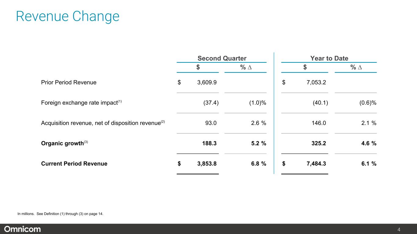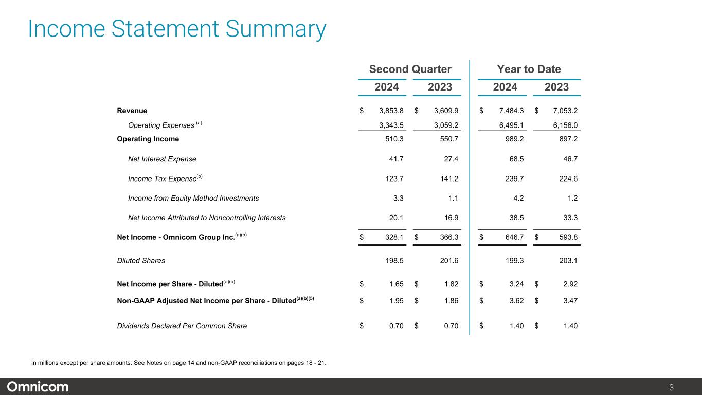 3 Second Quarter Year to Date 2024 2023 2024 2023 Revenue $ 3,853.8 $ 3,609.9 $ 7,484.3 $ 7,053.2 Operating Expenses (a) 3,343.5 3,059.2 6,495.1 6,156.0 Operating Income 510.3 550.7 989.2 897.2 Net Interest Expense 41.7 27.4 68.5 46.7 Income Tax Expense(b) 123.7 141.2 239.7 224.6 Income from Equity Method Investments 3.3 1.1 4.2 1.2 Net Income Attributed to Noncontrolling Interests 20.1 16.9 38.5 33.3 Net Income - Omnicom Group Inc.(a)(b) $ 328.1 $ 366.3 $ 646.7 $ 593.8 Diluted Shares 198.5 201.6 199.3 203.1 Net Income per Share - Diluted(a)(b) $ 1.65 $ 1.82 $ 3.24 $ 2.92 Non-GAAP Adjusted Net Income per Share - Diluted(a)(b)(5) $ 1.95 $ 1.86 $ 3.62 $ 3.47 Dividends Declared Per Common Share $ 0.70 $ 0.70 $ 1.40 $ 1.40 Income Statement Summary In millions except per share amounts. See Notes on page 14 and non-GAAP reconciliations on pages 18 - 21.