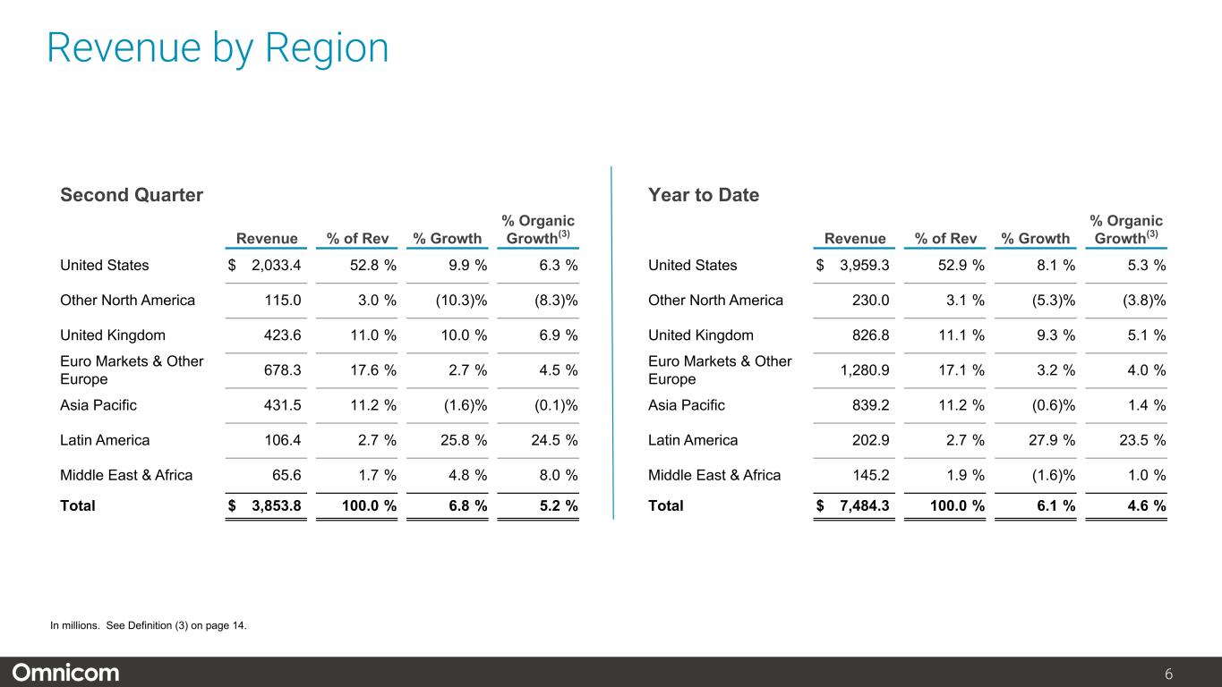 5 Revenue by Discipline Second Quarter Year to Date Revenue % of Rev % Growth % Organic Growth(3) Revenue % of Rev % Growth % Organic Growth(3) Advertising & Media $ 2,046.8 53.1 % 7.1 % 7.8 % Advertising & Media $ 3,953.6 52.8 % 7.2 % 7.4 % Precision Marketing 438.8 11.4 % 18.9 % 1.4 % Precision Marketing 877.0 11.7 % 20.3 % 2.9 % Public Relations 418.2 10.8 % 6.3 % 0.9 % Public Relations 808.5 10.8 % 5.1 % (0.1) % Healthcare 353.1 9.2 % 1.1 % 2.0 % Healthcare 676.7 9.1 % 1.3 % 2.0 % Branding & Retail Commerce 199.3 5.2 % (5.3) % (3.8) % Branding & Retail Commerce 399.5 5.3 % (4.9) % (3.8) % Experiential 186.1 4.8 % 13.2 % 17.6 % Experiential 346.0 4.6 % 10.8 % 13.7 % Execution & Support 211.5 5.5 % — % 1.2 % Execution & Support 423.0 5.7 % (9.4) % (1.8) % Total $ 3,853.8 100.0 % 6.8 % 5.2 % Total $ 7,484.3 100.0 % 6.1 % 4.6 % In millions. See Definition (3) on page 14. Precision Marketing discipline includes Flywheel Digital.