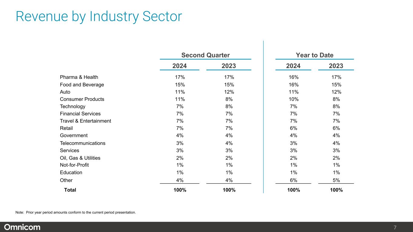 7 Second Quarter Year to Date 2024 2023 2024 2023 Pharma & Health 17% 17% 16% 17% Food and Beverage 15% 15% 16% 15% Auto 11% 12% 11% 12% Consumer Products 11% 8% 10% 8% Technology 7% 8% 7% 8% Financial Services 7% 7% 7% 7% Travel & Entertainment 7% 7% 7% 7% Retail 7% 7% 6% 6% Government 4% 4% 4% 4% Telecommunications 3% 4% 3% 4% Services 3% 3% 3% 3% Oil, Gas & Utilities 2% 2% 2% 2% Not-for-Profit 1% 1% 1% 1% Education 1% 1% 1% 1% Other 4% 4% 6% 5% Total 100% 100% 100% 100% Revenue by Industry Sector Note: Prior year period amounts conform to the current period presentation.
