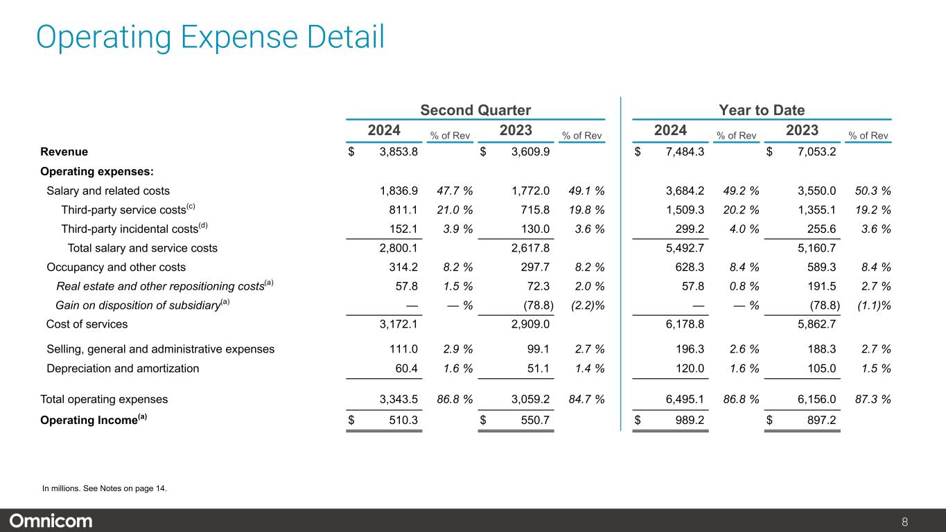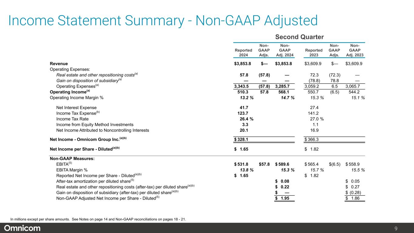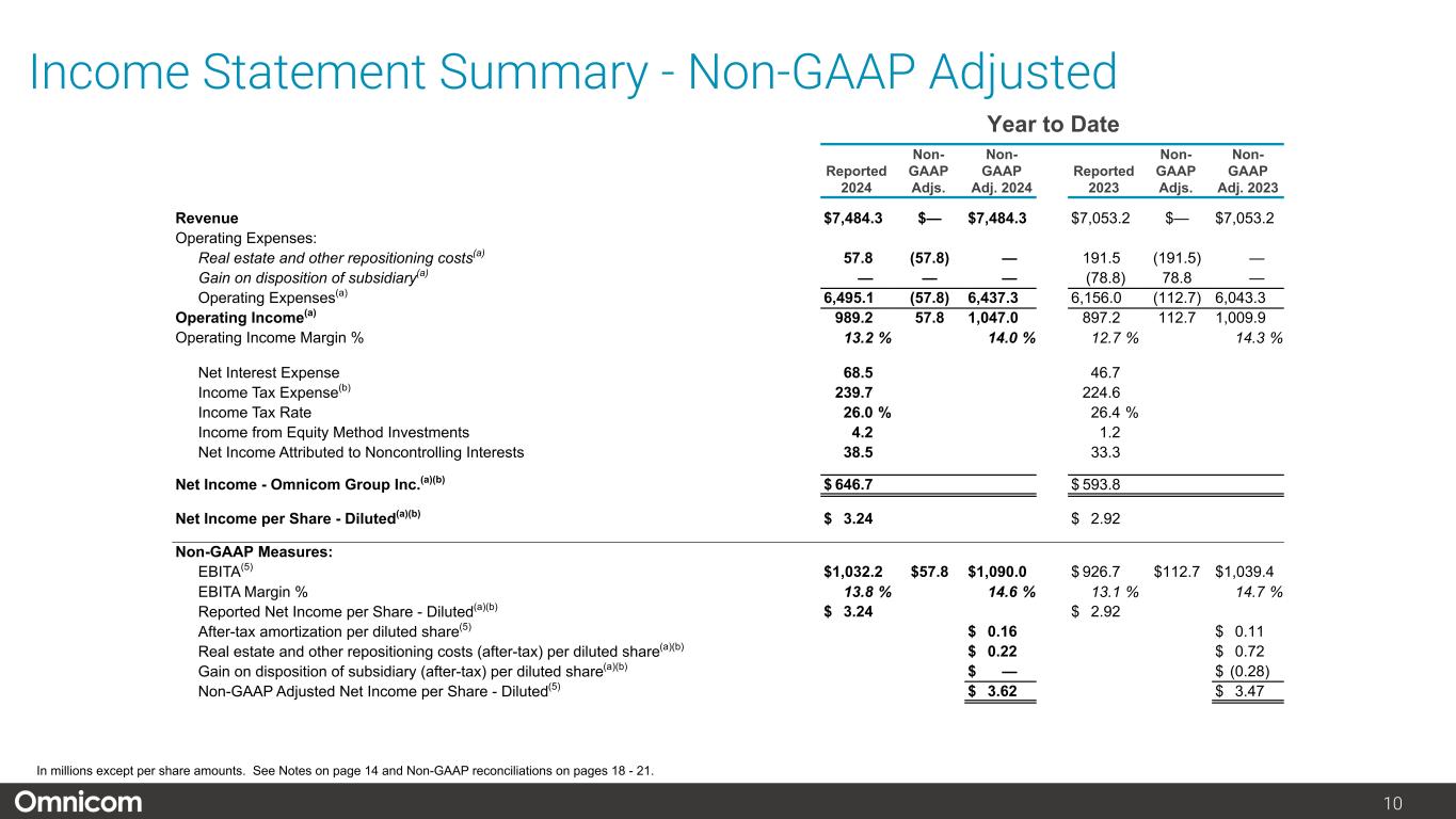 10 Year to Date Reported 2024 Non- GAAP Adjs. Non- GAAP Adj. 2024 Reported 2023 Non- GAAP Adjs. Non- GAAP Adj. 2023 Revenue $ 7,484.3 $— $ 7,484.3 $ 7,053.2 $— $ 7,053.2 Operating Expenses: Real estate and other repositioning costs(a) 57.8 (57.8) — 191.5 (191.5) — Gain on disposition of subsidiary(a) — — — (78.8) 78.8 — Operating Expenses(a) 6,495.1 (57.8) 6,437.3 6,156.0 (112.7) 6,043.3 Operating Income(a) 989.2 57.8 1,047.0 897.2 112.7 1,009.9 Operating Income Margin % 13.2 % 14.0 % 12.7 % 14.3 % Net Interest Expense 68.5 46.7 Income Tax Expense(b) 239.7 224.6 Income Tax Rate 26.0 % 26.4 % Income from Equity Method Investments 4.2 1.2 Net Income Attributed to Noncontrolling Interests 38.5 33.3 Net Income - Omnicom Group Inc.(a)(b) $ 646.7 $ 593.8 Net Income per Share - Diluted(a)(b) $ 3.24 $ 2.92 Non-GAAP Measures: EBITA(5) $ 1,032.2 $57.8 $ 1,090.0 $ 926.7 $112.7 $ 1,039.4 EBITA Margin % 13.8 % 14.6 % 13.1 % 14.7 % Reported Net Income per Share - Diluted(a)(b) $ 3.24 $ 2.92 After-tax amortization per diluted share(5) $ 0.16 $ 0.11 Real estate and other repositioning costs (after-tax) per diluted share(a)(b) $ 0.22 $ 0.72 Gain on disposition of subsidiary (after-tax) per diluted share(a)(b) $ — $ (0.28) Non-GAAP Adjusted Net Income per Share - Diluted(5) $ 3.62 $ 3.47 Income Statement Summary - Non-GAAP Adjusted In millions except per share amounts. See Notes on page 14 and Non-GAAP reconciliations on pages 18 - 21.