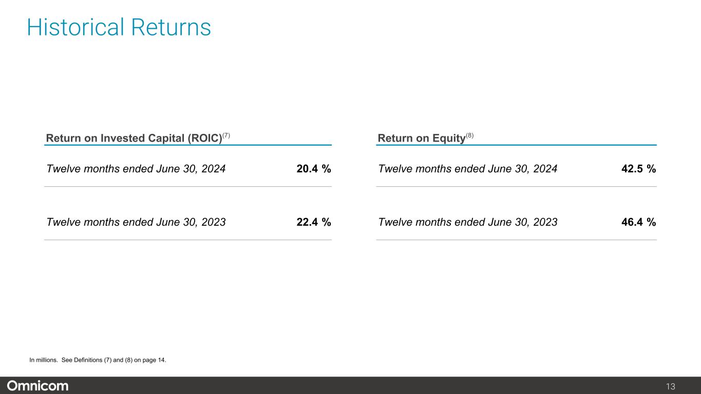 13 Historical Returns Return on Invested Capital (ROIC)(7) Return on Equity(8) Twelve months ended June 30, 2024 20.4 % Twelve months ended June 30, 2024 42.5 % Twelve months ended June 30, 2023 22.4 % Twelve months ended June 30, 2023 46.4 % In millions. See Definitions (7) and (8) on page 14.