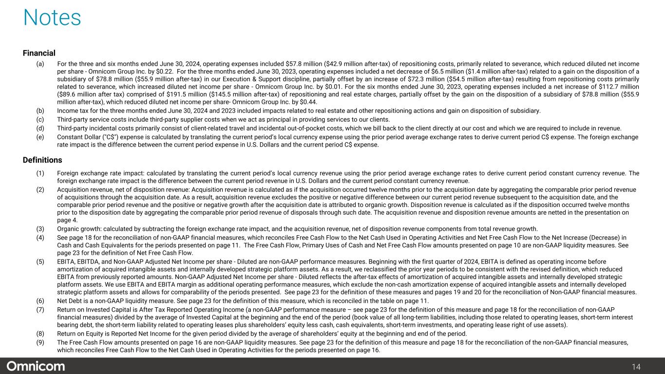 14 Notes (a) For the three and six months ended June 30, 2024, operating expenses included $57.8 million ($42.9 million after-tax) of repositioning costs, primarily related to severance, which reduced diluted net income per share - Omnicom Group Inc. by $0.22. For the three months ended June 30, 2023, operating expenses included a net decrease of $6.5 million ($1.4 million after-tax) related to a gain on the disposition of a subsidiary of $78.8 million ($55.9 million after-tax) in our Execution & Support discipline, partially offset by an increase of $72.3 million ($54.5 million after-tax) resulting from repositioning costs primarily related to severance, which increased diluted net income per share - Omnicom Group Inc. by $0.01. For the six months ended June 30, 2023, operating expenses included a net increase of $112.7 million ($89.6 million after tax) comprised of $191.5 million ($145.5 million after-tax) of repositioning and real estate charges, partially offset by the gain on the disposition of a subsidiary of $78.8 million ($55.9 million after-tax), which reduced diluted net income per share- Omnicom Group Inc. by $0.44. (b) Income tax for the three months ended June 30, 2024 and 2023 included impacts related to real estate and other repositioning actions and gain on disposition of subsidiary. (c) Third-party service costs include third-party supplier costs when we act as principal in providing services to our clients. (d) Third-party incidental costs primarily consist of client-related travel and incidental out-of-pocket costs, which we bill back to the client directly at our cost and which we are required to include in revenue. (e) Constant Dollar ("C$") expense is calculated by translating the current period’s local currency expense using the prior period average exchange rates to derive current period C$ expense. The foreign exchange rate impact is the difference between the current period expense in U.S. Dollars and the current period C$ expense. Financial Definitions (1) Foreign exchange rate impact: calculated by translating the current period’s local currency revenue using the prior period average exchange rates to derive current period constant currency revenue. The foreign exchange rate impact is the difference between the current period revenue in U.S. Dollars and the current period constant currency revenue. (2) Acquisition revenue, net of disposition revenue: Acquisition revenue is calculated as if the acquisition occurred twelve months prior to the acquisition date by aggregating the comparable prior period revenue of acquisitions through the acquisition date. As a result, acquisition revenue excludes the positive or negative difference between our current period revenue subsequent to the acquisition date, and the comparable prior period revenue and the positive or negative growth after the acquisition date is attributed to organic growth. Disposition revenue is calculated as if the disposition occurred twelve months prior to the disposition date by aggregating the comparable prior period revenue of disposals through such date. The acquisition revenue and disposition revenue amounts are netted in the presentation on page 4. (3) Organic growth: calculated by subtracting the foreign exchange rate impact, and the acquisition revenue, net of disposition revenue components from total revenue growth. (4) See page 18 for the reconciliation of non-GAAP financial measures, which reconciles Free Cash Flow to the Net Cash Used in Operating Activities and Net Free Cash Flow to the Net Increase (Decrease) in Cash and Cash Equivalents for the periods presented on page 11. The Free Cash Flow, Primary Uses of Cash and Net Free Cash Flow amounts presented on page 10 are non-GAAP liquidity measures. See page 23 for the definition of Net Free Cash Flow. (5) EBITA, EBITDA, and Non-GAAP Adjusted Net Income per share - Diluted are non-GAAP performance measures. Beginning with the first quarter of 2024, EBITA is defined as operating income before amortization of acquired intangible assets and internally developed strategic platform assets. As a result, we reclassified the prior year periods to be consistent with the revised definition, which reduced EBITA from previously reported amounts. Non-GAAP Adjusted Net Income per share - Diluted reflects the after-tax effects of amortization of acquired intangible assets and internally developed strategic platform assets. We use EBITA and EBITA margin as additional operating performance measures, which exclude the non-cash amortization expense of acquired intangible assets and internally developed strategic platform assets and allows for comparability of the periods presented. See page 23 for the definition of these measures and pages 19 and 20 for the reconciliation of Non-GAAP financial measures. (6) Net Debt is a non-GAAP liquidity measure. See page 23 for the definition of this measure, which is reconciled in the table on page 11. (7) Return on Invested Capital is After Tax Reported Operating Income (a non-GAAP performance measure – see page 23 for the definition of this measure and page 18 for the reconciliation of non-GAAP financial measures) divided by the average of Invested Capital at the beginning and the end of the period (book value of all long-term liabilities, including those related to operating leases, short-term interest bearing debt, the short-term liability related to operating leases plus shareholders’ equity less cash, cash equivalents, short-term investments, and operating lease right of use assets). (8) Return on Equity is Reported Net Income for the given period divided by the average of shareholders’ equity at the beginning and end of the period. (9) The Free Cash Flow amounts presented on page 16 are non-GAAP liquidity measures. See page 23 for the definition of this measure and page 18 for the reconciliation of the non-GAAP financial measures, which reconciles Free Cash Flow to the Net Cash Used in Operating 