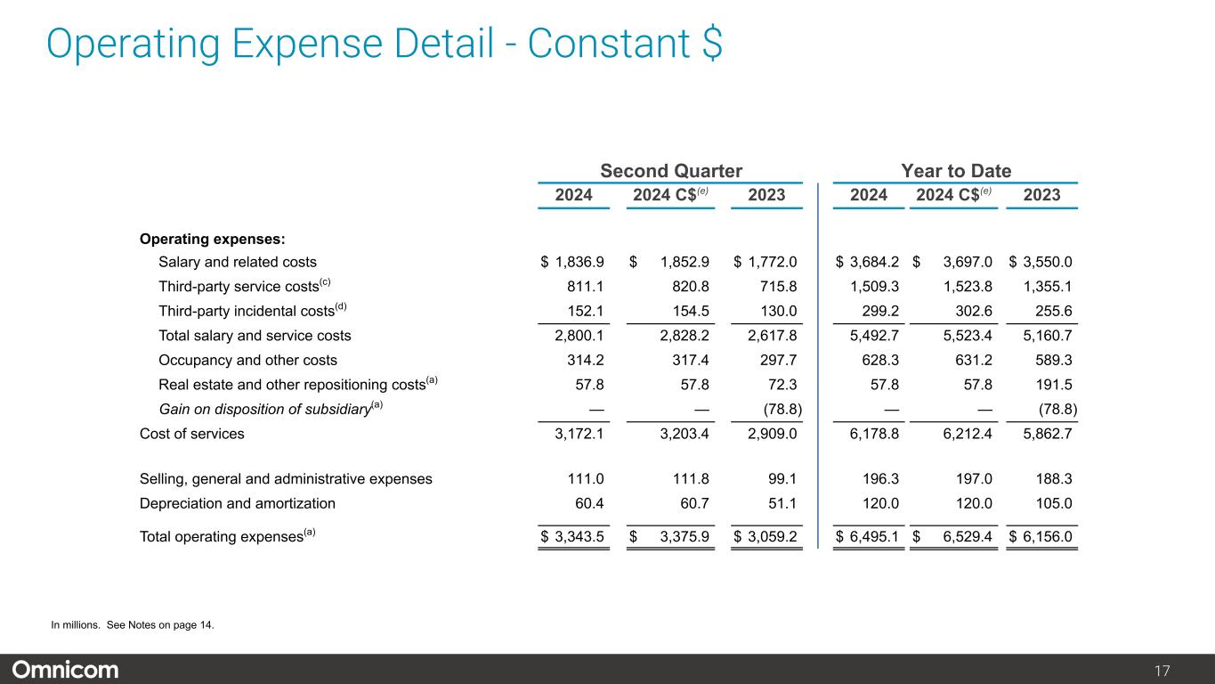 17 Operating Expense Detail - Constant $ Second Quarter Year to Date 2024 2024 C$(e) 2023 2024 2024 C$(e) 2023 Operating expenses: Salary and related costs $ 1,836.9 $ 1,852.9 $ 1,772.0 $ 3,684.2 $ 3,697.0 $ 3,550.0 Third-party service costs(c) 811.1 820.8 715.8 1,509.3 1,523.8 1,355.1 Third-party incidental costs(d) 152.1 154.5 130.0 299.2 302.6 255.6 Total salary and service costs 2,800.1 2,828.2 2,617.8 5,492.7 5,523.4 5,160.7 Occupancy and other costs 314.2 317.4 297.7 628.3 631.2 589.3 Real estate and other repositioning costs(a) 57.8 57.8 72.3 57.8 57.8 191.5 Gain on disposition of subsidiary(a) — — (78.8) — — (78.8) Cost of services 3,172.1 3,203.4 2,909.0 6,178.8 6,212.4 5,862.7 Selling, general and administrative expenses 111.0 111.8 99.1 196.3 197.0 188.3 Depreciation and amortization 60.4 60.7 51.1 120.0 120.0 105.0 Total operating expenses(a) $ 3,343.5 $ 3,375.9 $ 3,059.2 $ 6,495.1 $ 6,529.4 $ 6,156.0 In millions. See Notes on page 14.