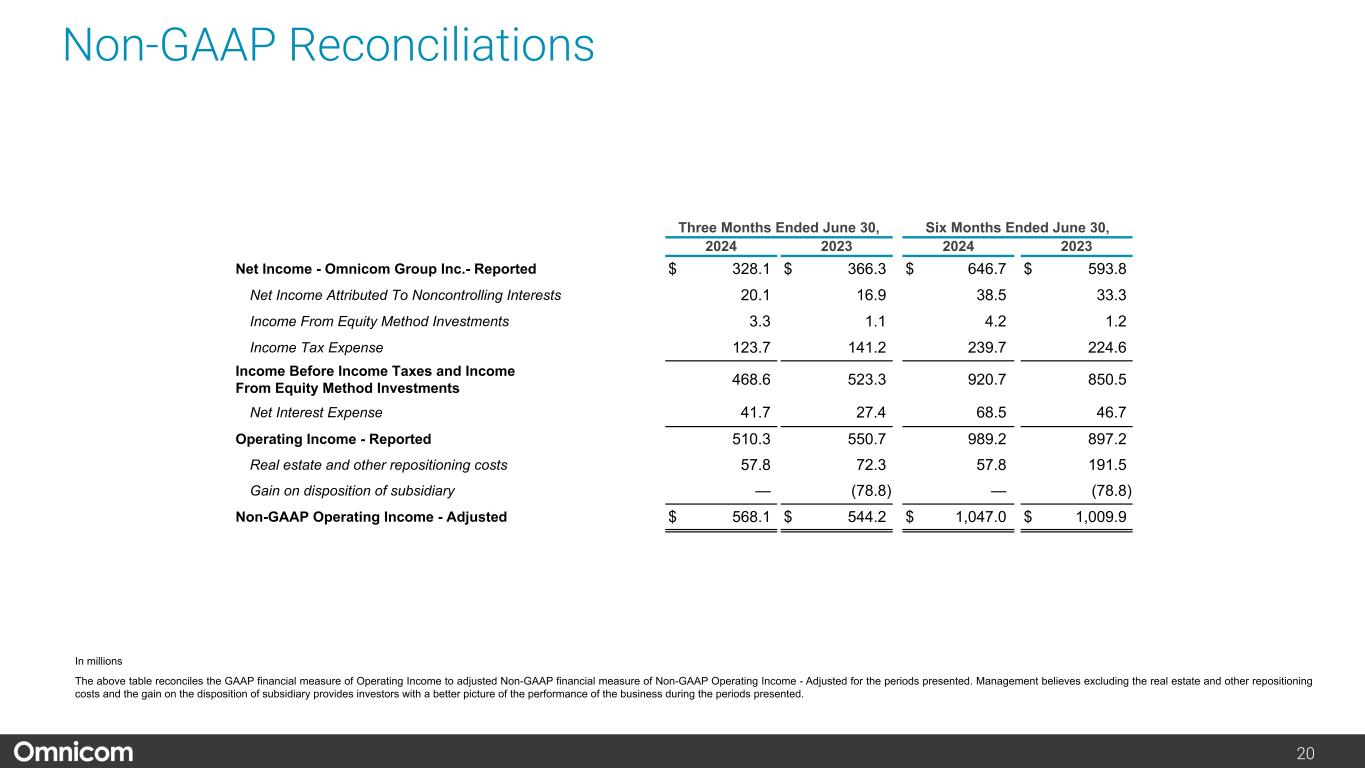 20 Non-GAAP Reconciliations In millions The above table reconciles the GAAP financial measure of Operating Income to adjusted Non-GAAP financial measure of Non-GAAP Operating Income - Adjusted for the periods presented. Management believes excluding the real estate and other repositioning costs and the gain on the disposition of subsidiary provides investors with a better picture of the performance of the business during the periods presented. Three Months Ended June 30, Six Months Ended June 30, 2024 2023 2024 2023 Net Income - Omnicom Group Inc.- Reported $ 328.1 $ 366.3 $ 646.7 $ 593.8 Net Income Attributed To Noncontrolling Interests 20.1 16.9 38.5 33.3 Income From Equity Method Investments 3.3 1.1 4.2 1.2 Income Tax Expense 123.7 141.2 239.7 224.6 Income Before Income Taxes and Income From Equity Method Investments 468.6 523.3 920.7 850.5 Net Interest Expense 41.7 27.4 68.5 46.7 Operating Income - Reported 510.3 550.7 989.2 897.2 Real estate and other repositioning costs 57.8 72.3 57.8 191.5 Gain on disposition of subsidiary — (78.8) — (78.8) Non-GAAP Operating Income - Adjusted $ 568.1 $ 544.2 $ 1,047.0 $ 1,009.9
