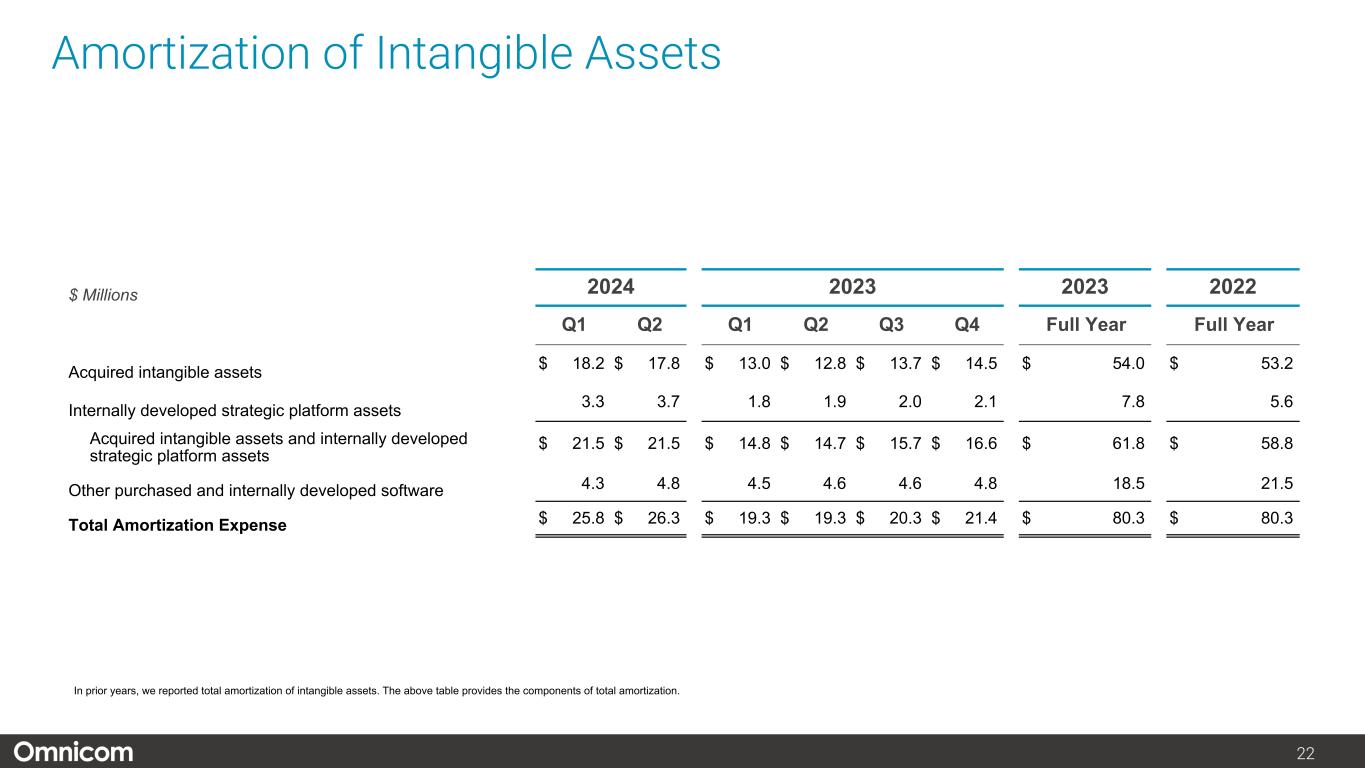 21 Second Quarter Year to Date 2024 2023 2024 2023 Net Income - Omnicom Group Inc. - Reported $ 328.1 $ 366.3 $ 646.7 $ 593.8 Impact on Net Income related to: Real estate and other repositioning costs 42.9 54.5 42.9 145.5 Gain on disposition of subsidiary — (55.9) — (55.9) Amortization of acquired intangible assets and internally developed strategic platform assets (after-tax) 15.9 10.9 31.8 21.8 Non-GAAP Net Income - Omnicom Group Inc. - Adjusted $ 386.9 $ 375.8 $ 721.4 $ 705.2 Diluted Shares 198.5 201.6 199.3 203.1 Reported Net Income per Share - Diluted $ 1.65 $ 1.82 $ 3.24 $ 2.92 Real estate and other repositioning costs - after-tax $ 0.22 $ 0.27 $ 0.22 $ 0.72 Gain on disposition of subsidiary - after-tax $ — $ (0.28) $ — $ (0.28) Amortization of acquired intangible assets and internally developed strategic platform assets (after-tax) $ 0.08 $ 0.05 $ 0.16 $ 0.11 Non-GAAP Adjusted Net Income per Share - Omnicom Group Inc. $ 1.95 $ 1.86 $ 3.62 $ 3.47 Non-GAAP Reconciliations In millions The above table reconciles the GAAP financial measure of Net Income-Omnicom Group Inc. to Non-GAAP Net Income-Omnicom Group Inc.-Adjusted for the periods presented. Management believes these non-GAAP measures are useful for investors to evaluate the comparability of the performance of our business year to year.