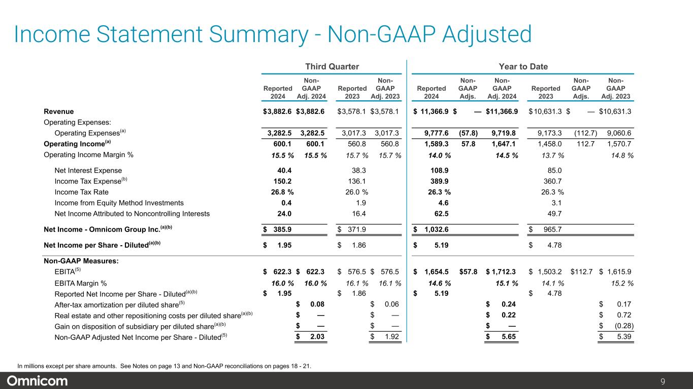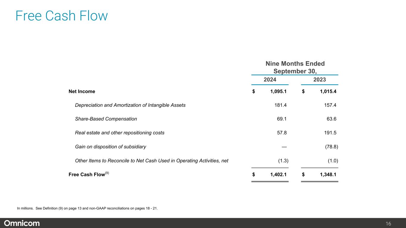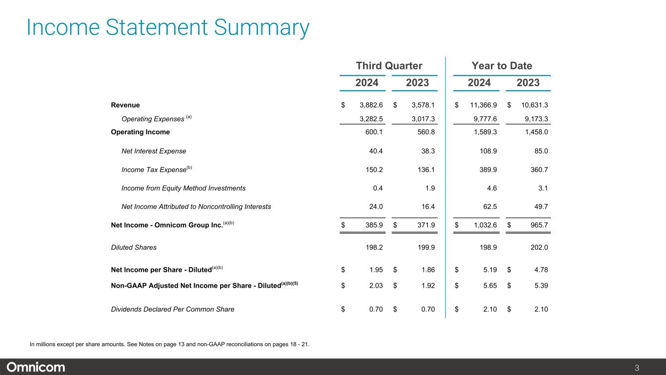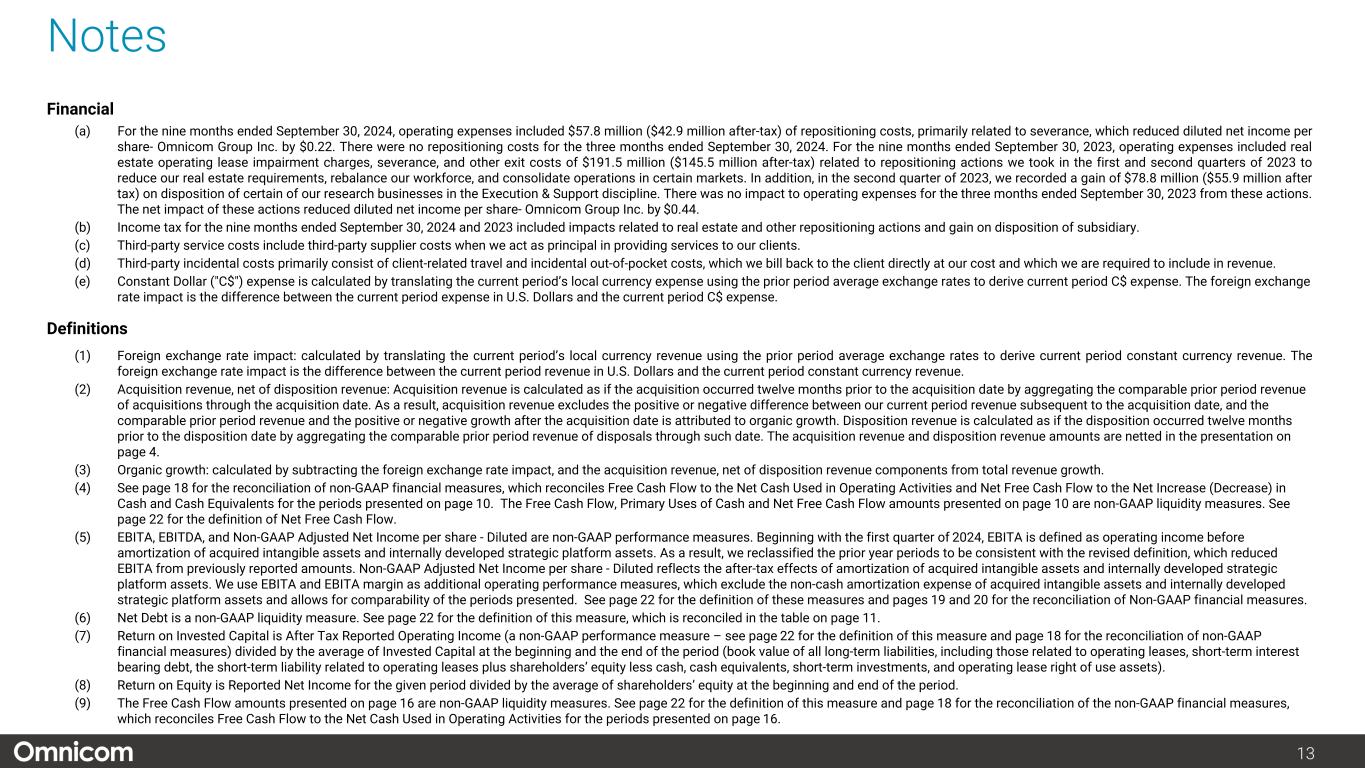 13 Notes (a) For the nine months ended September 30, 2024, operating expenses included $57.8 million ($42.9 million after-tax) of repositioning costs, primarily related to severance, which reduced diluted net income per share- Omnicom Group Inc. by $0.22. There were no repositioning costs for the three months ended September 30, 2024. For the nine months ended September 30, 2023, operating expenses included real estate operating lease impairment charges, severance, and other exit costs of $191.5 million ($145.5 million after-tax) related to repositioning actions we took in the first and second quarters of 2023 to reduce our real estate requirements, rebalance our workforce, and consolidate operations in certain markets. In addition, in the second quarter of 2023, we recorded a gain of $78.8 million ($55.9 million after tax) on disposition of certain of our research businesses in the Execution & Support discipline. There was no impact to operating expenses for the three months ended September 30, 2023 from these actions. The net impact of these actions reduced diluted net income per share- Omnicom Group Inc. by $0.44. (b) Income tax for the nine months ended September 30, 2024 and 2023 included impacts related to real estate and other repositioning actions and gain on disposition of subsidiary. (c) Third-party service costs include third-party supplier costs when we act as principal in providing services to our clients. (d) Third-party incidental costs primarily consist of client-related travel and incidental out-of-pocket costs, which we bill back to the client directly at our cost and which we are required to include in revenue. (e) Constant Dollar ("C$") expense is calculated by translating the current period’s local currency expense using the prior period average exchange rates to derive current period C$ expense. The foreign exchange rate impact is the difference between the current period expense in U.S. Dollars and the current period C$ expense. Financial Definitions (1) Foreign exchange rate impact: calculated by translating the current period’s local currency revenue using the prior period average exchange rates to derive current period constant currency revenue. The foreign exchange rate impact is the difference between the current period revenue in U.S. Dollars and the current period constant currency revenue. (2) Acquisition revenue, net of disposition revenue: Acquisition revenue is calculated as if the acquisition occurred twelve months prior to the acquisition date by aggregating the comparable prior period revenue of acquisitions through the acquisition date. As a result, acquisition revenue excludes the positive or negative difference between our current period revenue subsequent to the acquisition date, and the comparable prior period revenue and the positive or negative growth after the acquisition date is attributed to organic growth. Disposition revenue is calculated as if the disposition occurred twelve months prior to the disposition date by aggregating the comparable prior period revenue of disposals through such date. The acquisition revenue and disposition revenue amounts are netted in the presentation on page 4. (3) Organic growth: calculated by subtracting the foreign exchange rate impact, and the acquisition revenue, net of disposition revenue components from total revenue growth. (4) See page 18 for the reconciliation of non-GAAP financial measures, which reconciles Free Cash Flow to the Net Cash Used in Operating Activities and Net Free Cash Flow to the Net Increase (Decrease) in Cash and Cash Equivalents for the periods presented on page 10. The Free Cash Flow, Primary Uses of Cash and Net Free Cash Flow amounts presented on page 10 are non-GAAP liquidity measures. See page 22 for the definition of Net Free Cash Flow. (5) EBITA, EBITDA, and Non-GAAP Adjusted Net Income per share - Diluted are non-GAAP performance measures. Beginning with the first quarter of 2024, EBITA is defined as operating income before amortization of acquired intangible assets and internally developed strategic platform assets. As a result, we reclassified the prior year periods to be consistent with the revised definition, which reduced EBITA from previously reported amounts. Non-GAAP Adjusted Net Income per share - Diluted reflects the after-tax effects of amortization of acquired intangible assets and internally developed strategic platform assets. We use EBITA and EBITA margin as additional operating performance measures, which exclude the non-cash amortization expense of acquired intangible assets and internally developed strategic platform assets and allows for comparability of the periods presented. See page 22 for the definition of these measures and pages 19 and 20 for the reconciliation of Non-GAAP financial measures. (6) Net Debt is a non-GAAP liquidity measure. See page 22 for the definition of this measure, which is reconciled in the table on page 11. (7) Return on Invested Capital is After Tax Reported Operating Income (a non-GAAP performance measure – see page 22 for the definition of this measure and page 18 for the reconciliation of non-GAAP financial measures) divided by the average of Invested Capital at the beginning and the end of the period (book value of all long-term liabilities, including those related to operating leases, short-term interest bearing debt, the short-term liability related to operating leases plus shareholders’ equity less cash, cash equivalents, short-term investments, and operating lease right of use assets). (8) Return on Equity is Reported Net Income for the given period divided by the average of shareholders’ equity at the beginning and end of the period. (9) The Free Cash Flow amounts presented on page 16 are non-GAAP liquidity measures. See page 22 for the definition of this measure and page 18 for the reconciliation of the non-GAAP financial measures, which reconciles Free Cash Flow to the Net Cash Used in Operating Activ